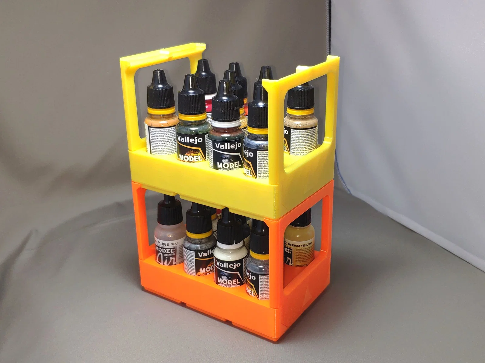 Khay Gridfinity 3x2 tiện lợi, đựng được 11 lọ sơn Vallejo với đường kính 25mm. Thiết kế có tay cầm giúp dễ dàng di chuyển và cho phép xếp chồng các khay lên nhau gọn gàng. Sản phẩm dễ lắp ráp, không cần dùng vít hay keo.