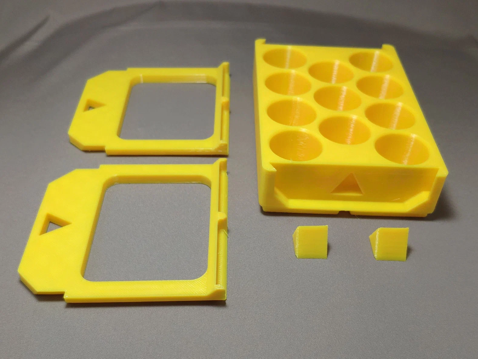 Khay Gridfinity 3x2 được thiết kế để chứa 11 lọ sơn Vallejo (đường kính 25mm). Các tấm vách bên được in rời. Chúng vừa đóng vai trò là tay cầm giúp dễ dàng di chuyển, vừa giúp bạn có thể xếp chồng các khay lên nhau.