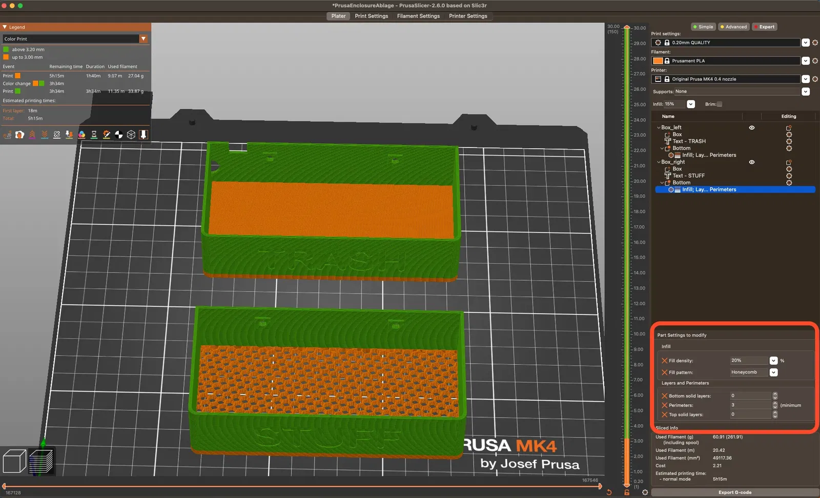 - Văn bản và đáy có thể tùy chỉnh trong eSlicer. (xem hình ảnh của slicer) Bao gồm trong tệp là một bộ điều chỉnh điều chỉnh độ đầy và chu vi. Trong ví dụ của tôi, tôi đã sử dụng độ đầy hình tổ ong 20% với 3 chu vi. (Vì vậy không có bụi có thể tích tụ trong đó haha)