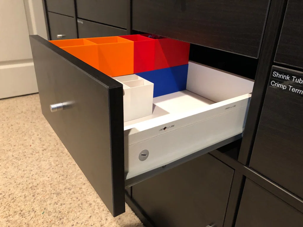 Kích thước chiều ngang đã được làm vừa khít, chiều dài ngắn hơn một chút để tránh vướng vào ốc vít của tay nắm hộc tủ nhô ra bên trong. Hãy in thêm miếng chêm (shim) và gắn vào mặt trước bên trong hộc tủ để giữ cho các ngăn được đẩy lùi về sau đều nhau và không chạm vào ốc vít. Nếu bạn định chồng tầng, hãy in thêm một miếng chêm để đặt ở vị trí cao hơn.