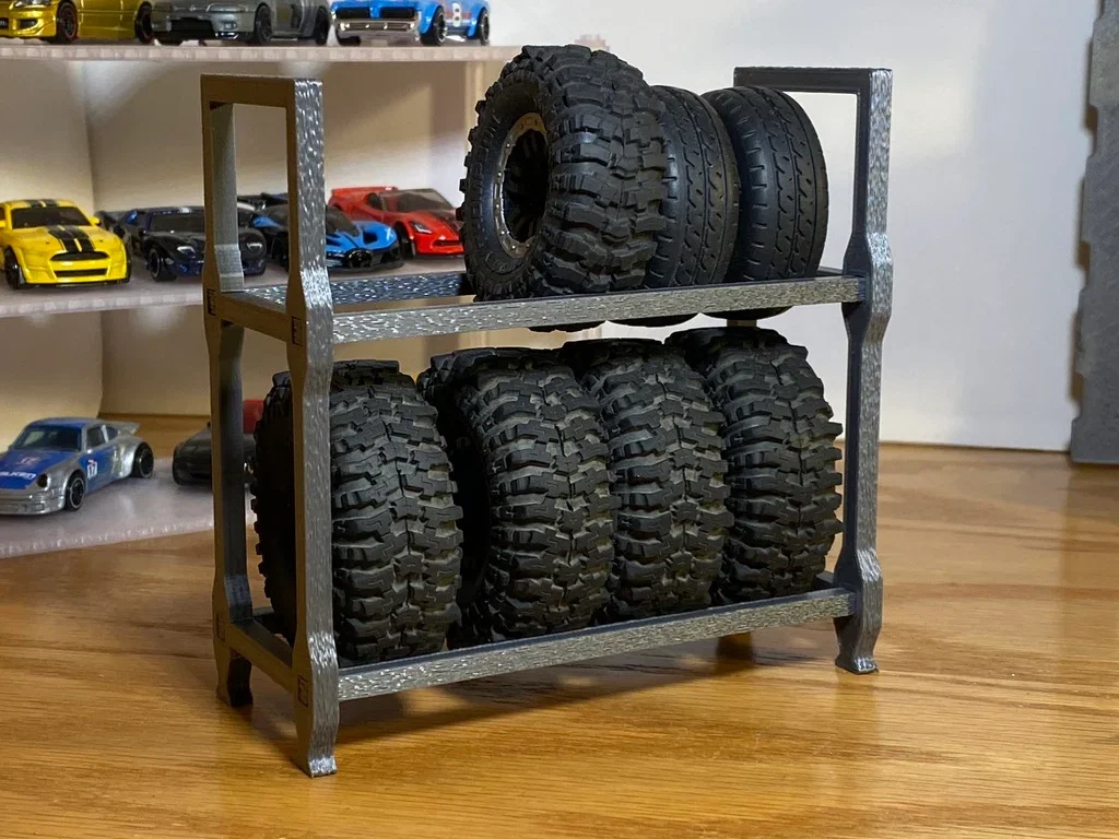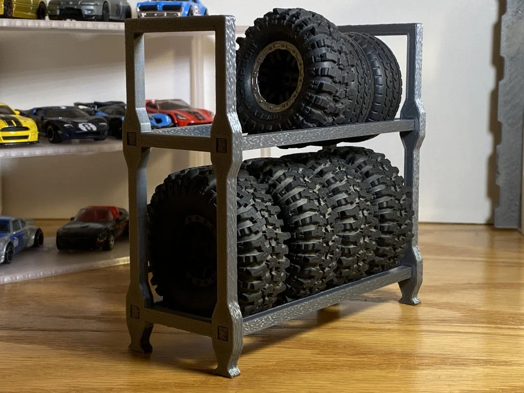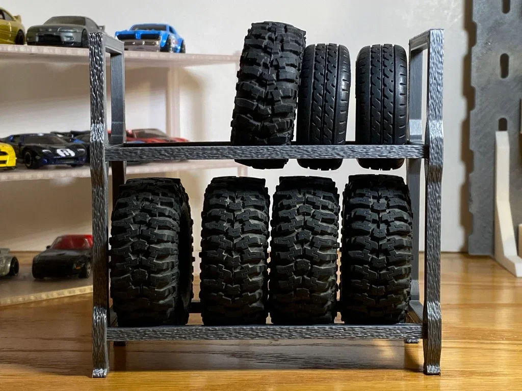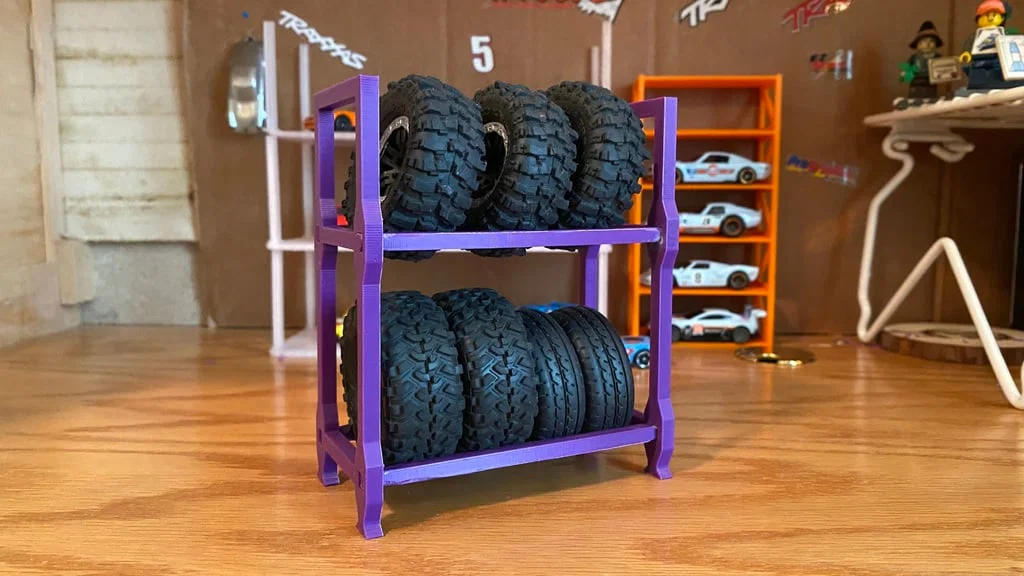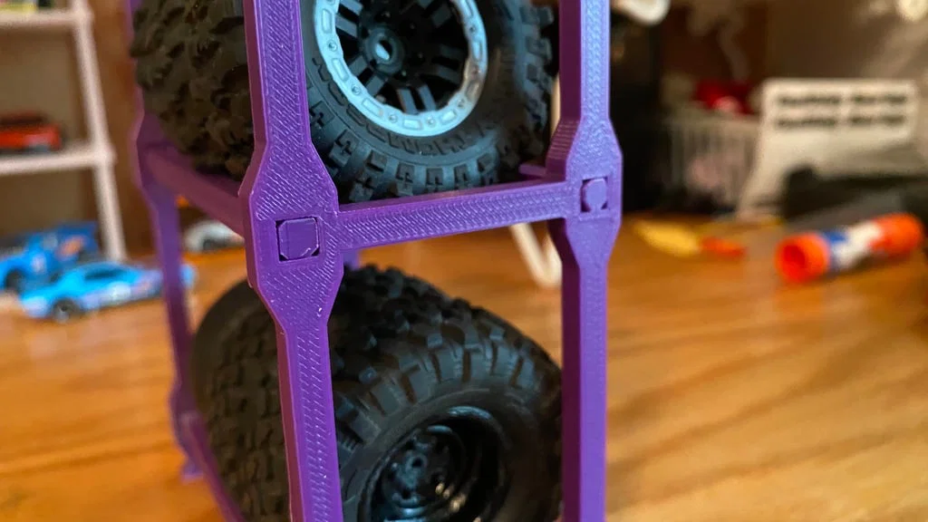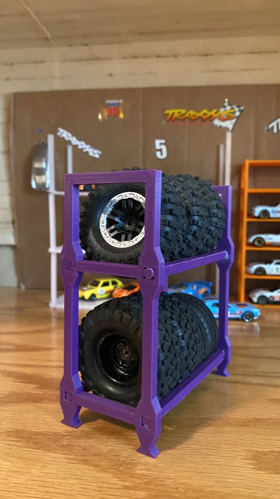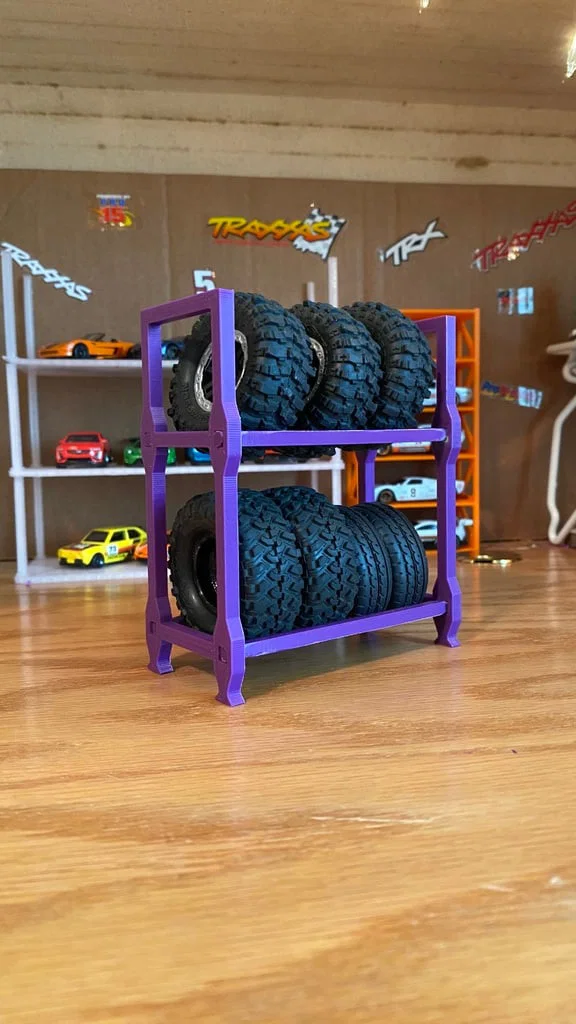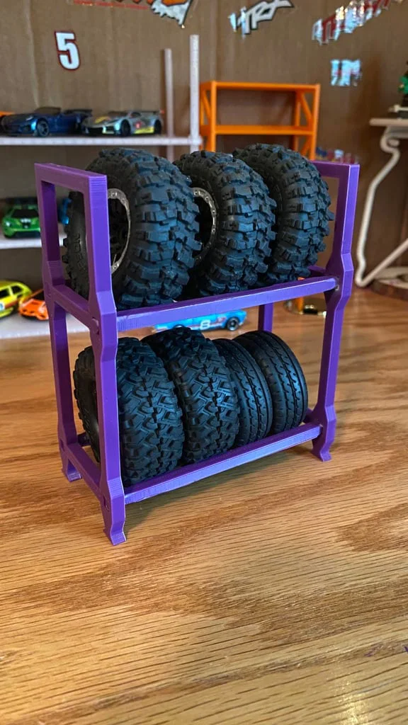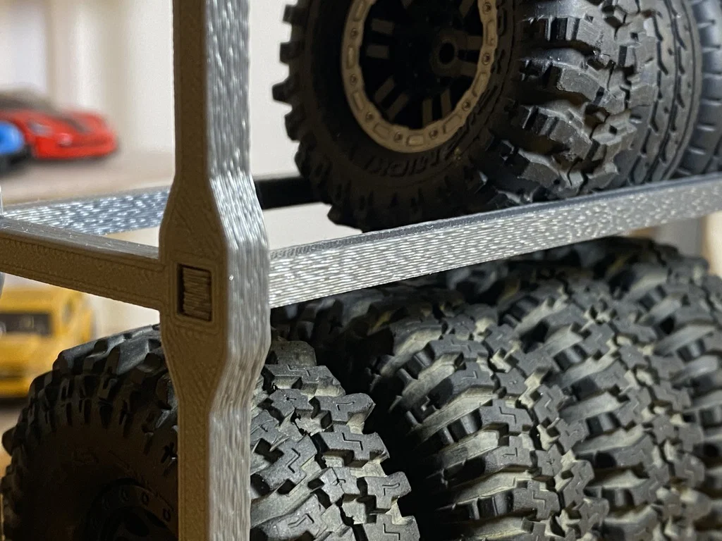 Đây là mẫu kệ để lốp được thiết kế theo tỉ lệ cho dòng xe Traxxas TRX4m. Có hai file đi kèm - file "1/18 Scale tire rack" bình thường được làm kích thước vừa cho hai bộ lốp zin của TRX4m (53mm x 20mm). File thứ hai là "1/18 Scale tire rack - oversized" sẽ để được tám lốp lớn hơn (61mm hoặc nhỏ hơn x 26mm hoặc nhỏ hơn). Bạn có thể in trực tiếp các kệ này từ file STL mà không cần chỉnh sửa gì thêm. Việc lắp ráp khá đơn giản. Bạn có thể dùng một chút keo nến hoặc keo dán sắt (CA glue) vào các khớp nối, nhưng thực tế thì các khớp nối đã rất khít ngay khi vừa in xong. Chỉ cần cắm các trụ vào khung hai bên là xong. Hiện tại mình đang dùng bản V2 cho cả hai file. Bản này đã khắc phục các vấn đề trước đây như bị cong vênh bàn in và độ khít quá chặt. Bây giờ mọi thứ đều vừa vặn và in ấn rất ổn. Mẫu này cũng có thể dùng cho tỉ lệ 1/24, tuy nhiên có thể sẽ hơi lớn một chút. Nếu bạn đang chơi SCX24 và muốn bản có tỉ lệ chuẩn hơn thì cứ cho mình biết, mình sẽ sẵn lòng điều chỉnh lại kích thước. CẬP NHẬT - 5/1/2025 Cuối cùng mình cũng đã in xong bản oversized, chính là cái màu bạc trong ảnh. Mình in bằng chế độ "fuzzy skin" để tạo bề mặt nhám, nhìn khá là xịn. Nếu bạn in mẫu này, nhớ đăng thành quả lên cho mọi người cùng xem nhé! Việc đó giúp mình biết được mức độ quan tâm của cộng đồng và cải thiện sản phẩm tốt hơn. Phản hồi của các bạn cực kỳ có giá trị với mình! ### Thiết lập in (Print Settings) Rafts: Không cần Supports: Không cần
