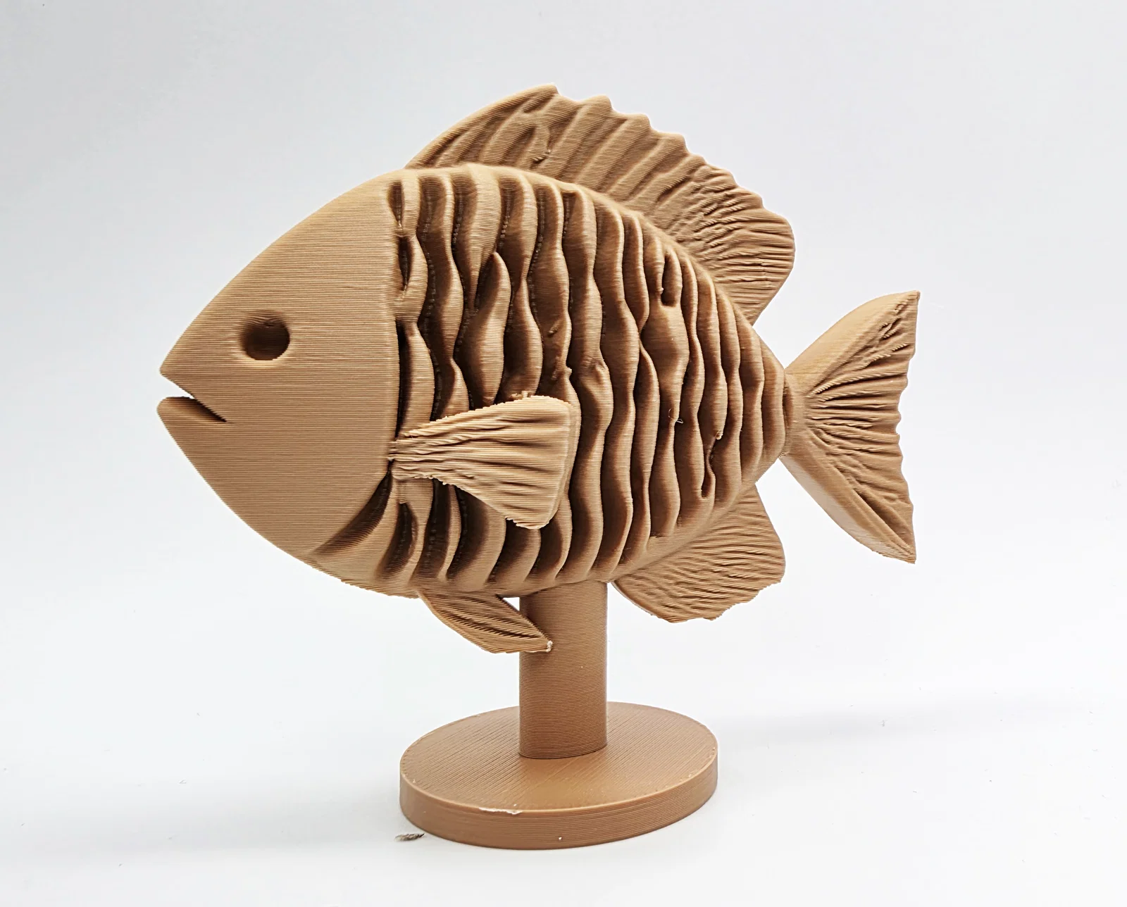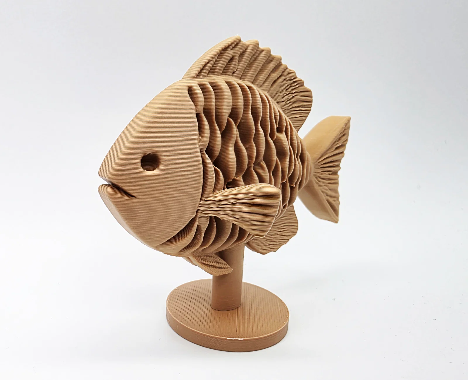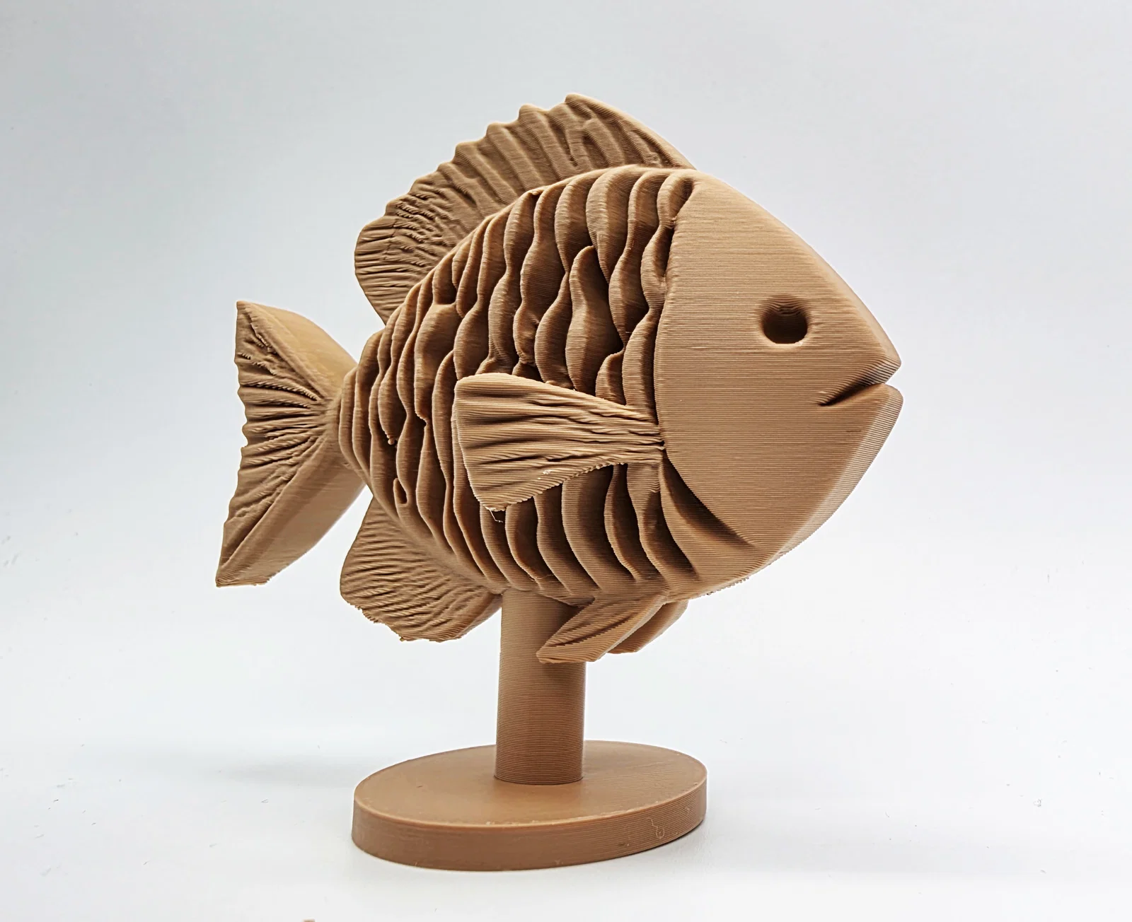 Một mẫu cá điêu khắc gỗ đơn giản đặt trên kệ, một món đồ trang trí vô cùng thú vị và bắt mắt cho không gian của bạn. Mẫu in này được tối ưu hóa để dễ dàng tháo gỡ hỗ trợ khi in.