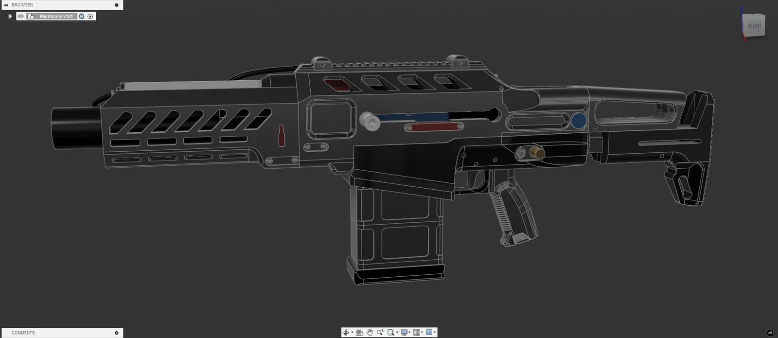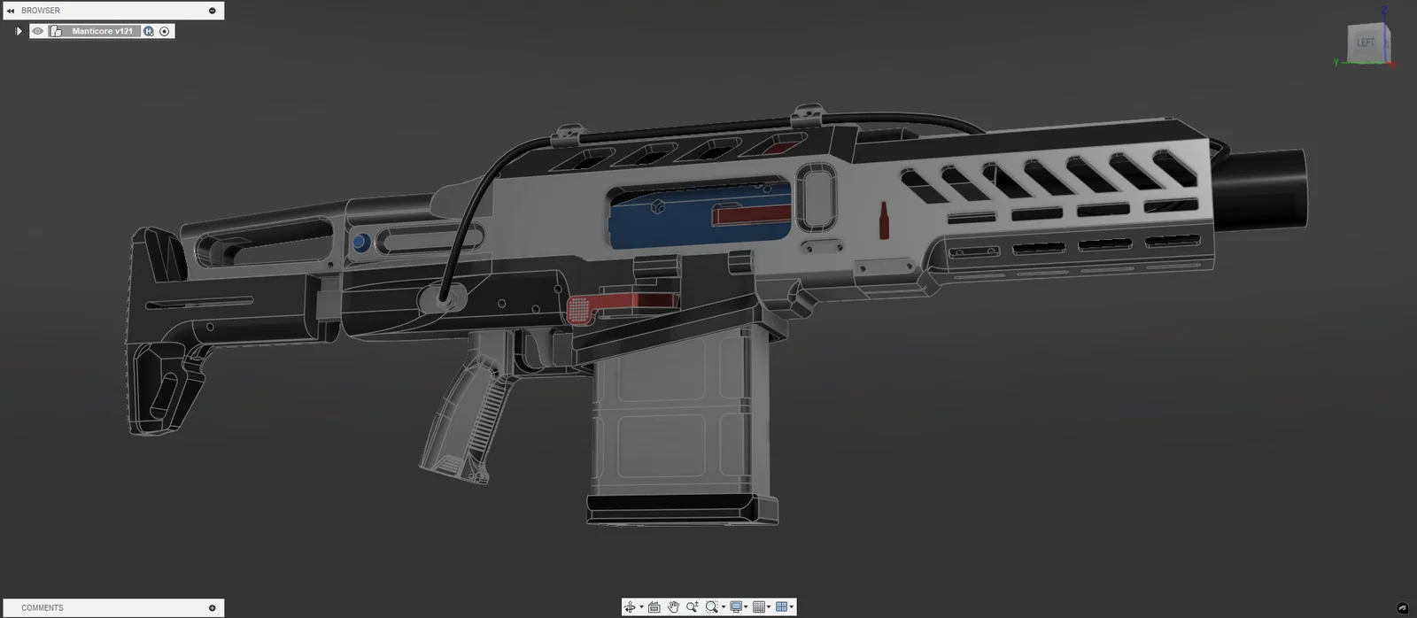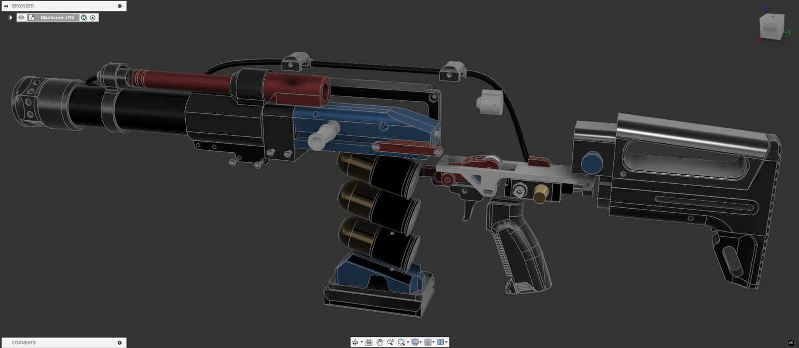 Manticore là mẫu súng phóng lựu airsoft 40mm chạy HPA, hỗ trợ bắn bán tự động và có cơ chế đẩy vỏ đạn đầu tiên trên thế giới. Thiết kế phù hợp cho các loại đạn 40mm ngắn, sử dụng in 3D kết hợp với các linh kiện cơ khí thông dụng.