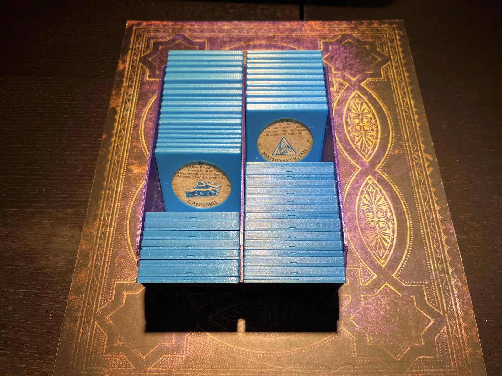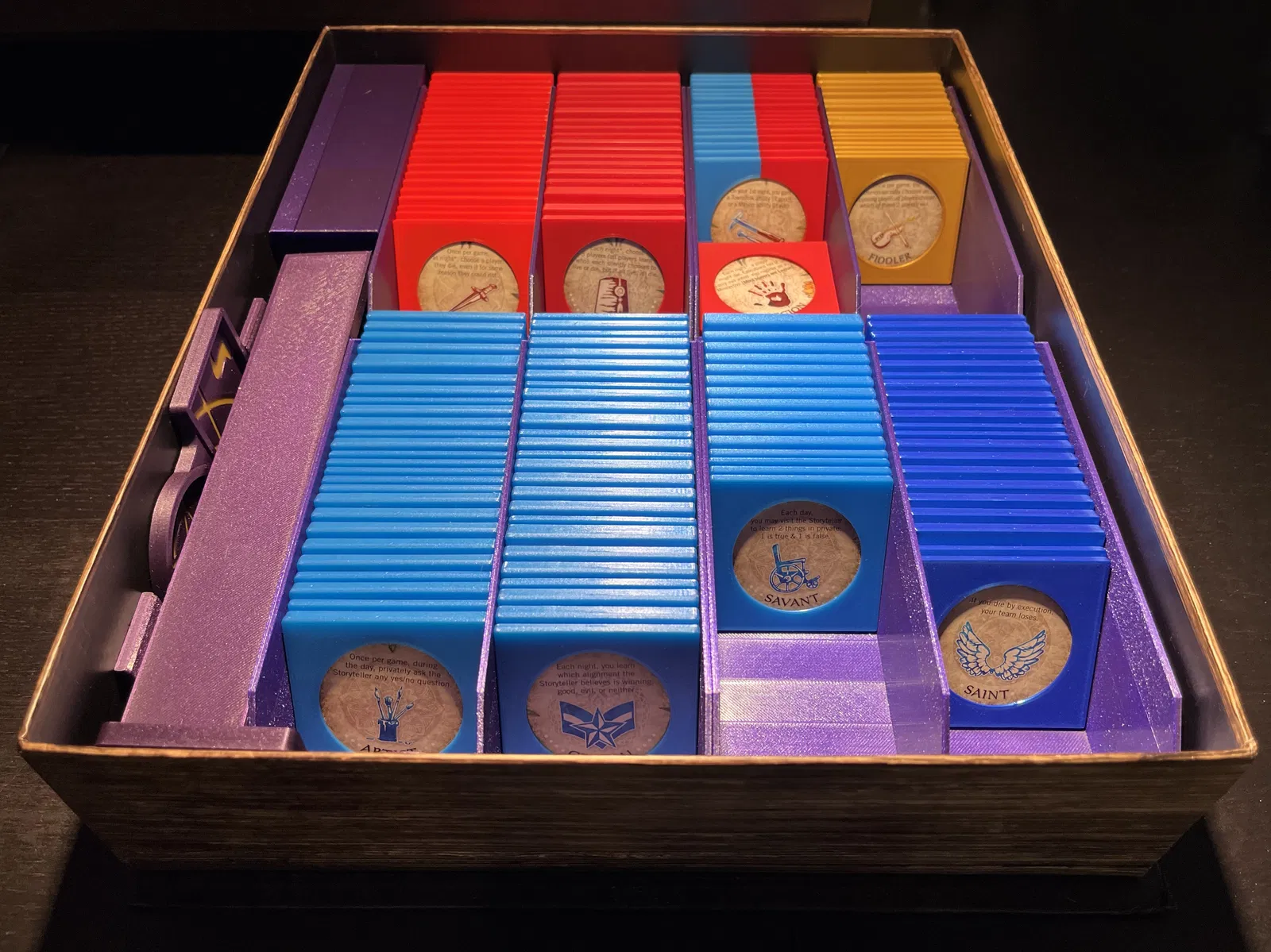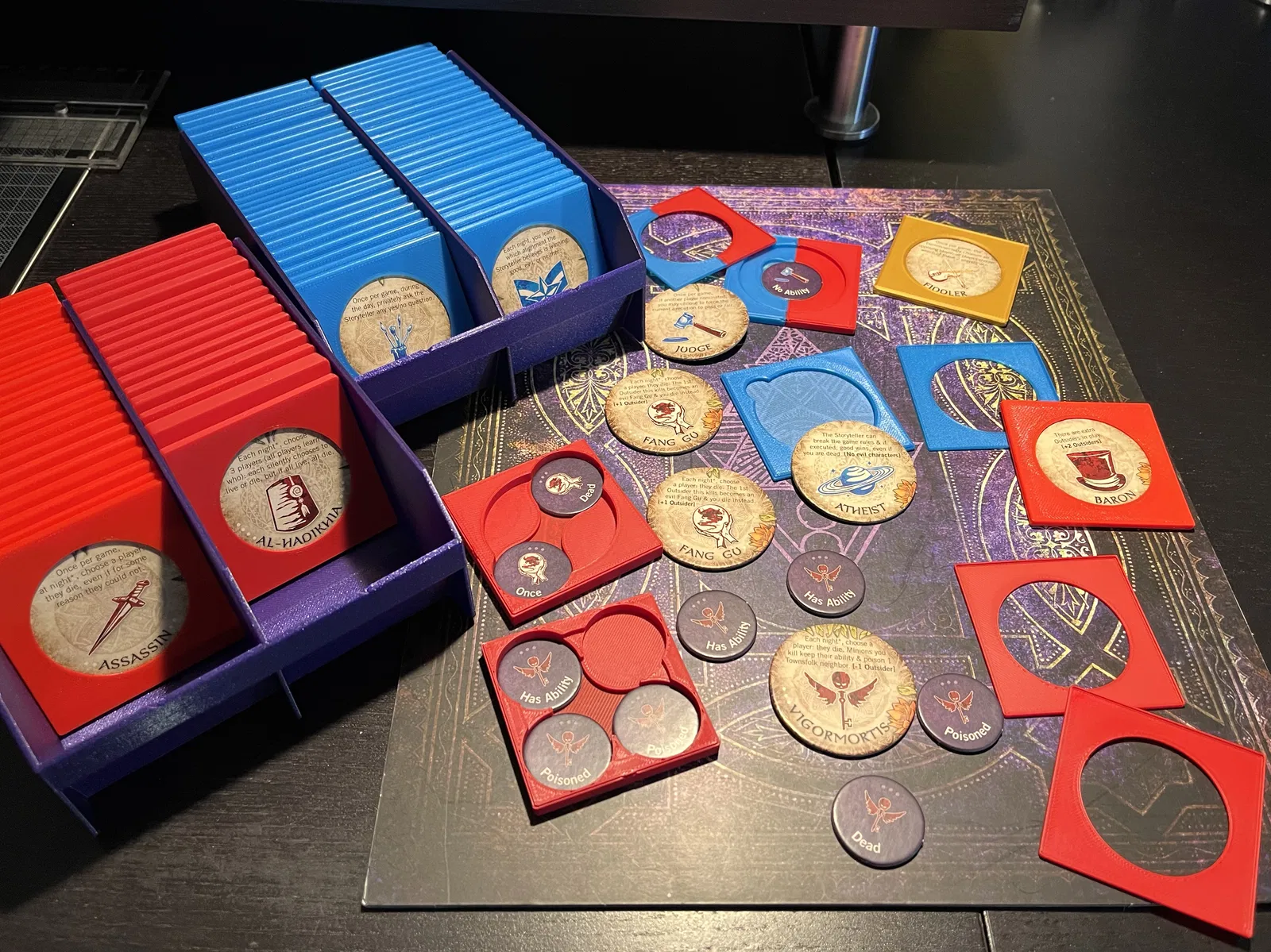 Bộ khay lưu trữ tiện lợi cho Blood on the Clocktower. Mỗi nhân vật có hộp riêng kèm token nhắc nhớ, thiết kế như rolodex giúp bạn lấy token cực nhanh. Tương thích với script gốc và các bản custom, hỗ trợ in bằng PLA.