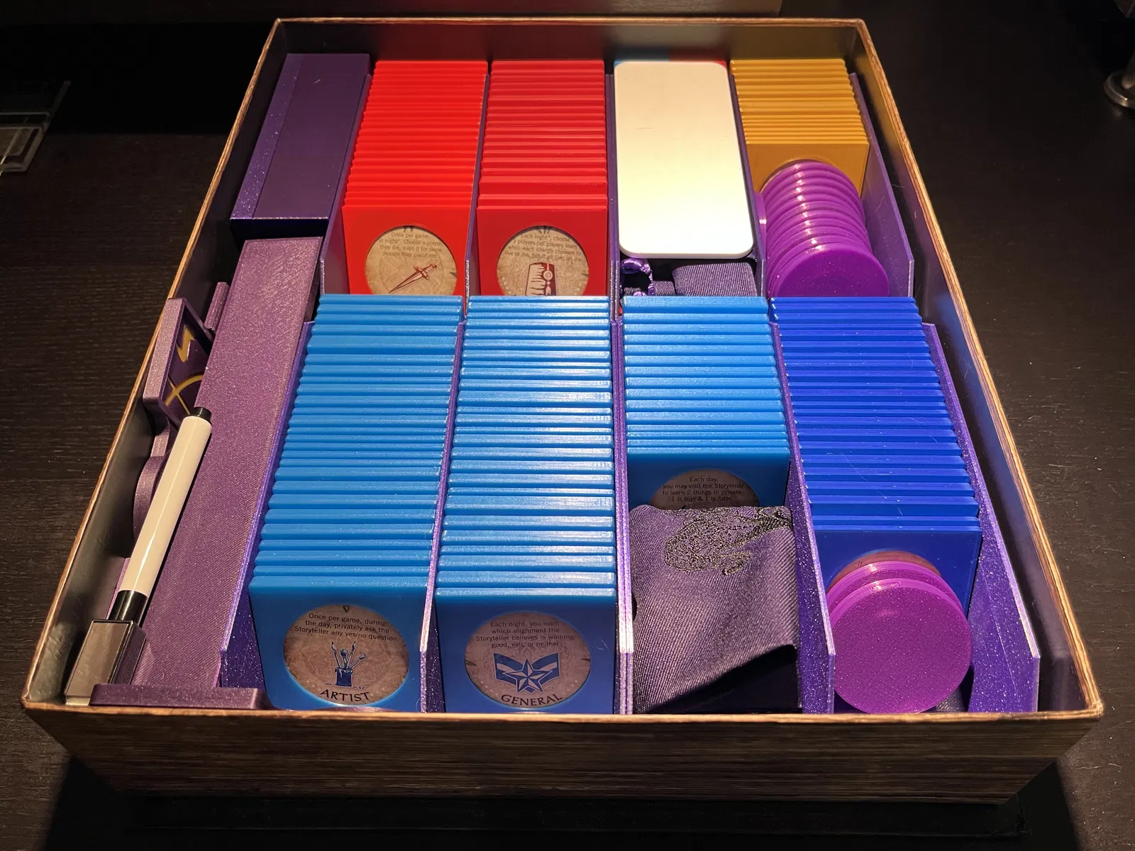 • Tui có dùng Bộ nâng cấp của BGExpansions cho BotC nên các khay này vẫn còn dư chỗ để đựng tụi nó. Tui cũng tự làm giải pháp để đựng mấy token khác, bạn có thể xem tại đây: . Mấy cái hộp tròn màu tím bạn thấy trong ảnh là do tui tự làm, giúp che bớt sự khác biệt giữa token thật và token tự chế.