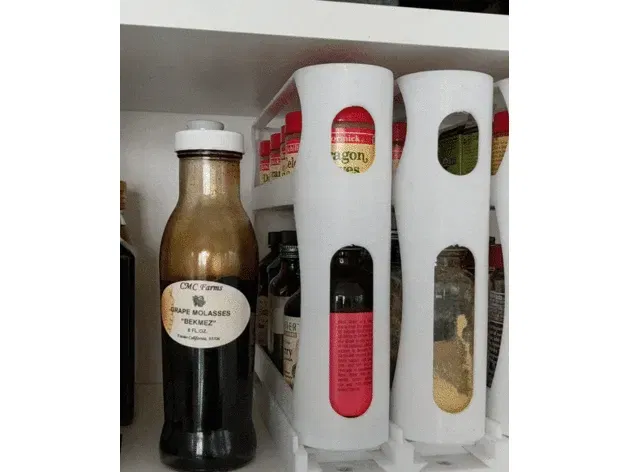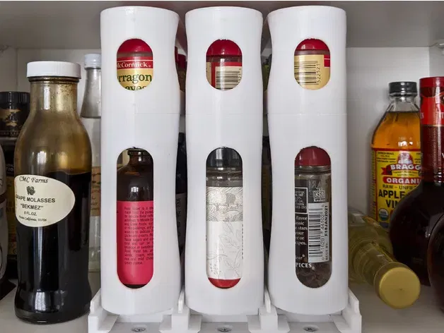 Tôi đã thực hiện một phiên bản remix của thiết kế này sử dụng ít nhựa hơn và do đó in nhanh hơn, có thể dễ dàng điều chỉnh cho các lọ gia vị có chiều cao khác nhau, và có vẻ ngoài hiện đại hơn. Nó yêu cầu mua các thanh kim loại. (Giá đỡ Gia vị Kéo ra với Các thanh Kim loại)
