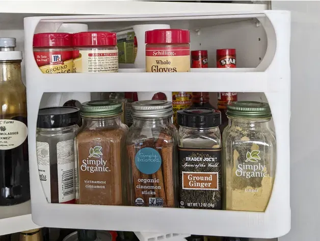 Tôi muốn có một cách tốt hơn để tổ chức các loại gia vị trong một chiếc tủ nhưng vẫn chiếm một không gian hạn chế. Tôi đã thiết kế giá đỡ gia vị kéo ra này để cho phép một hoặc nhiều kệ kéo ra cho các loại gia vị. Giá đỡ có thể kéo ra và xoay 90 độ theo cả hai hướng để truy cập vào các loại gia vị của bạn. Có hai kệ trên giá đỡ cho phép các lọ gia vị ngắn ở trên và các chai tròn hoặc vuông lớn hơn ở dưới.