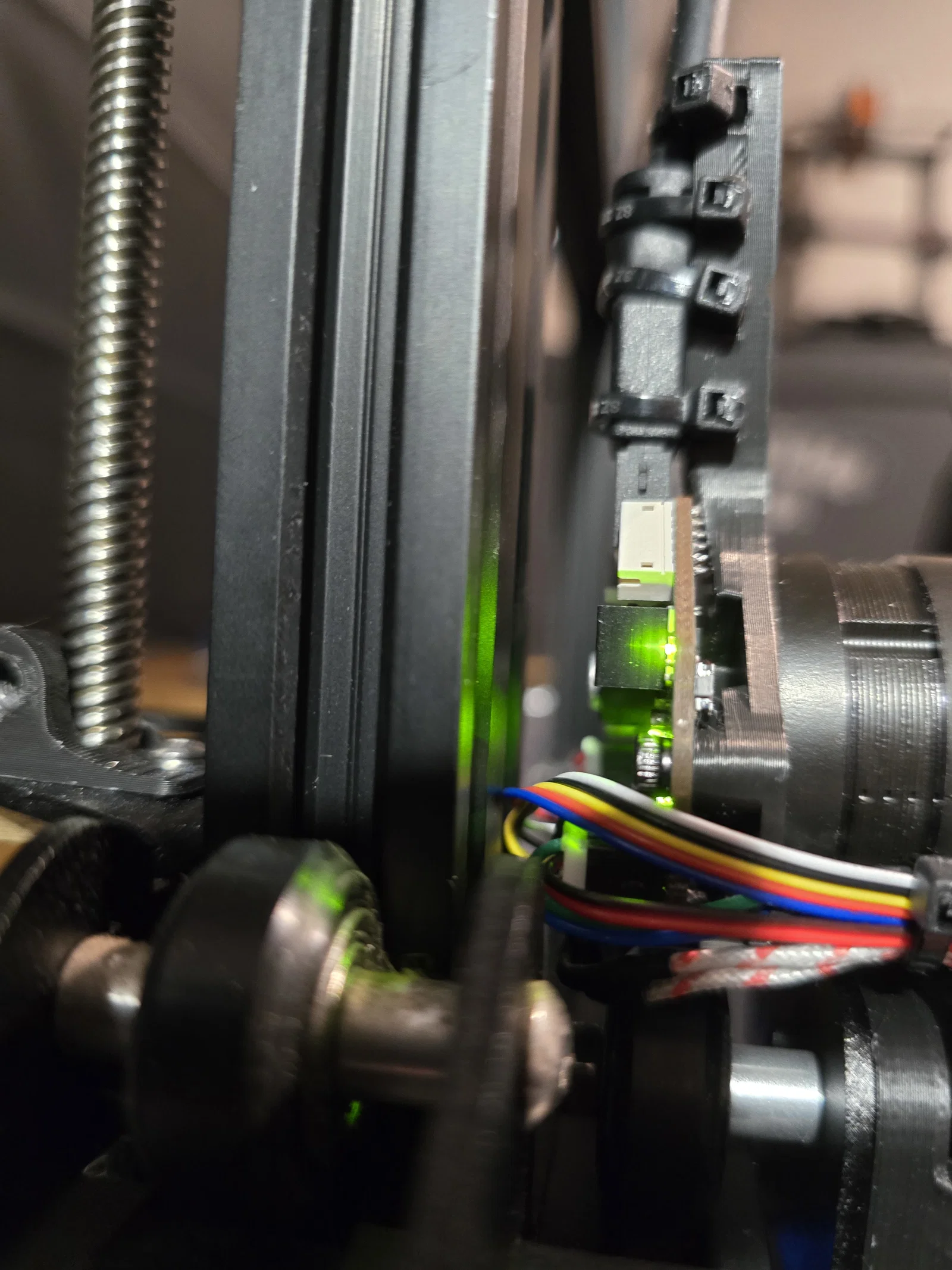 Như đã nói, mình dùng NH36 và O2.5. Mình làm ngàm đủ sâu để mạch điện không chạm vào khung nhôm đứng (kể cả khi dây được buộc chặt) và vẫn còn vài mm khoảng trống khi homing trục X (như hình minh họa). Thêm vào đó, điều này có nghĩa là bạn không cần thay đổi gì để dùng công tắc hành trình X gốc.