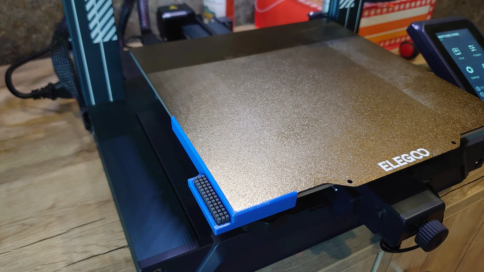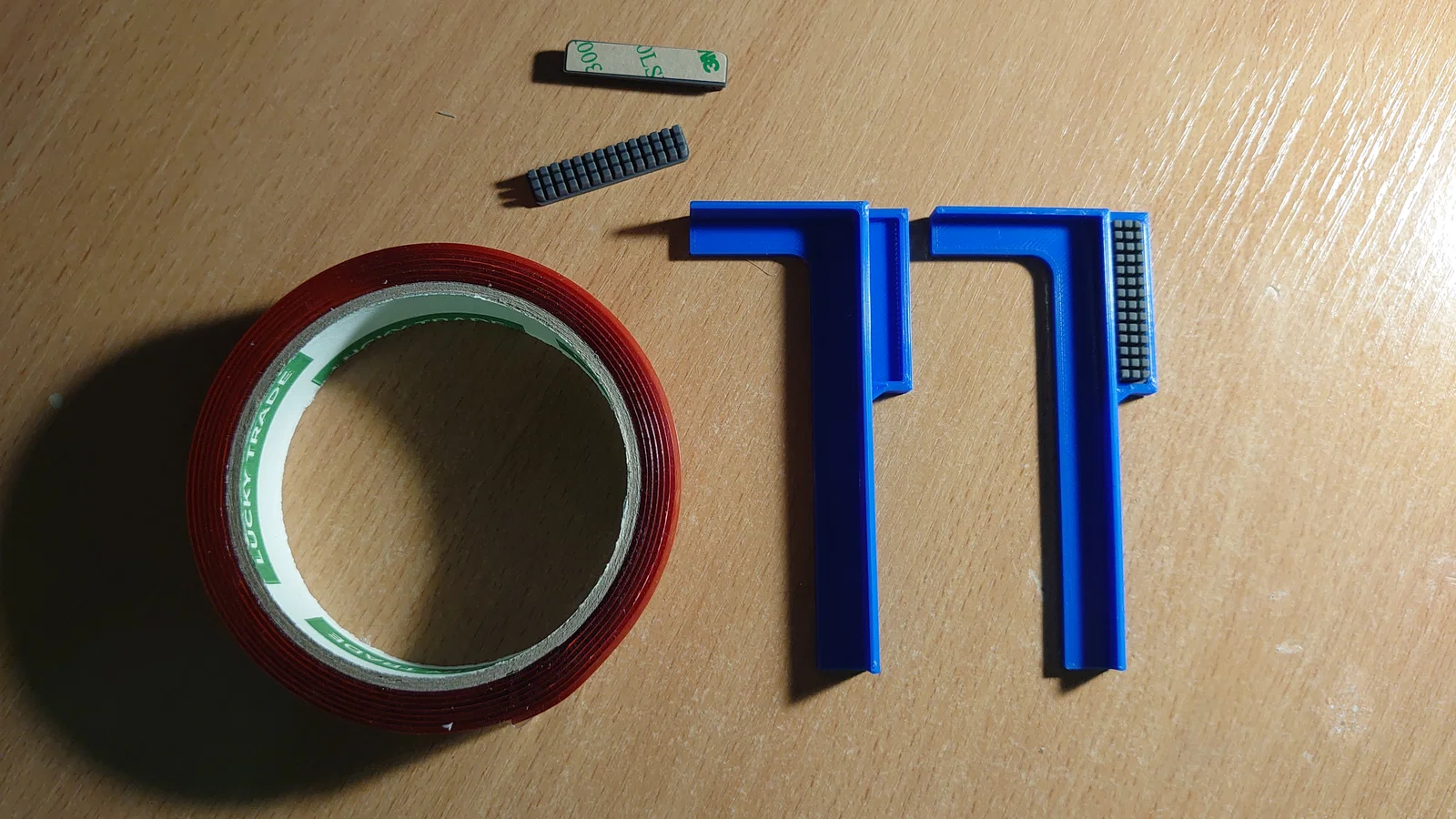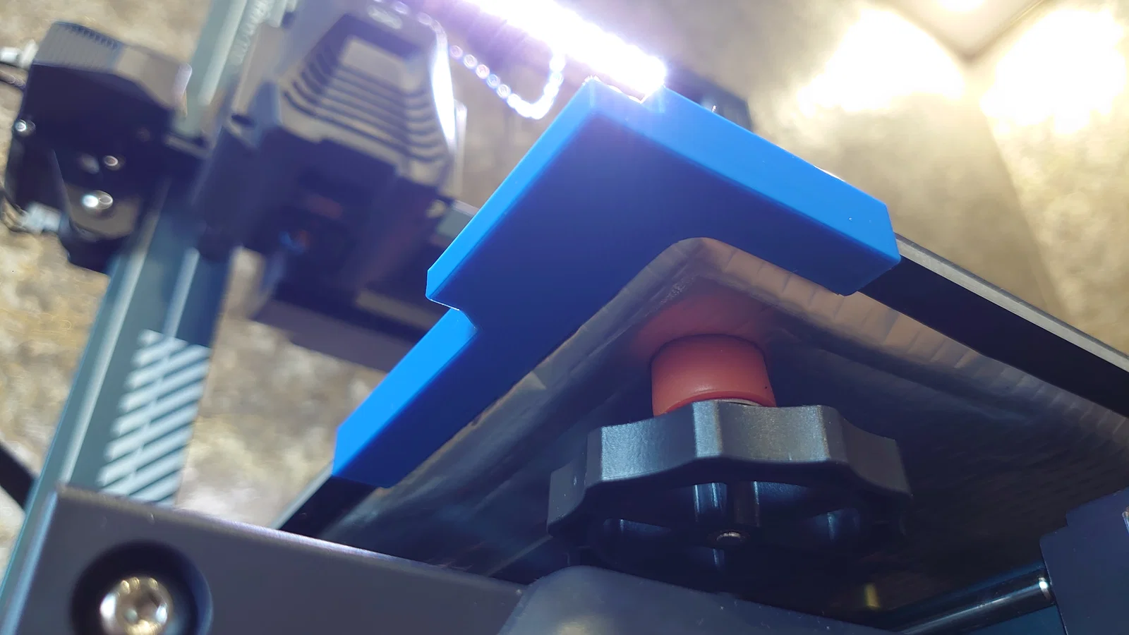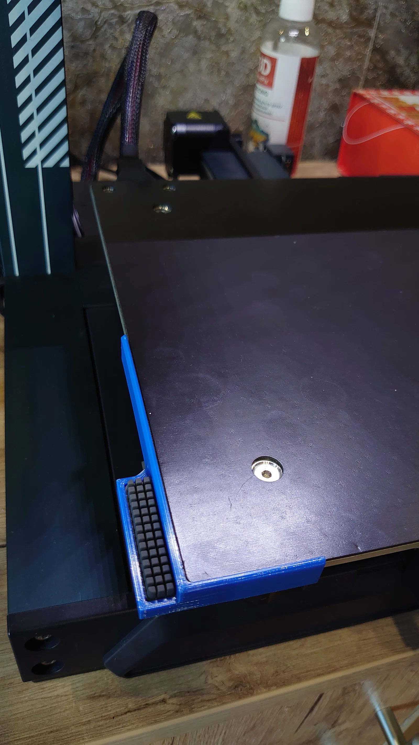 Để gắn đế giữ vào máy, bạn có thể dùng băng dính hai mặt chịu nhiệt hoặc keo dán. Theo kinh nghiệm của mình, chỉ cần dùng loại băng dính mút xốp acrylic là ổn. Bạn hãy bóc lớp bảo vệ băng dính rồi dán chi tiết vào góc trước bên trái của bàn in. Nếu dùng keo dán, hãy nhớ kẹp cố định chi tiết vào bàn in và đợi keo khô hoàn toàn nhé.