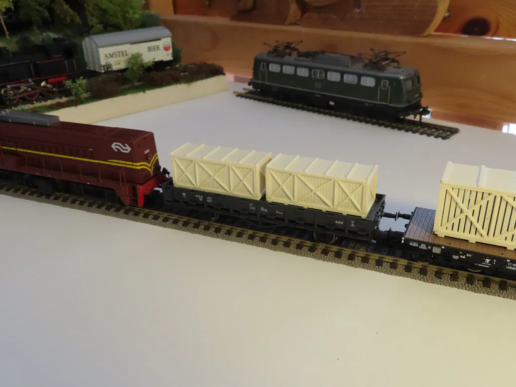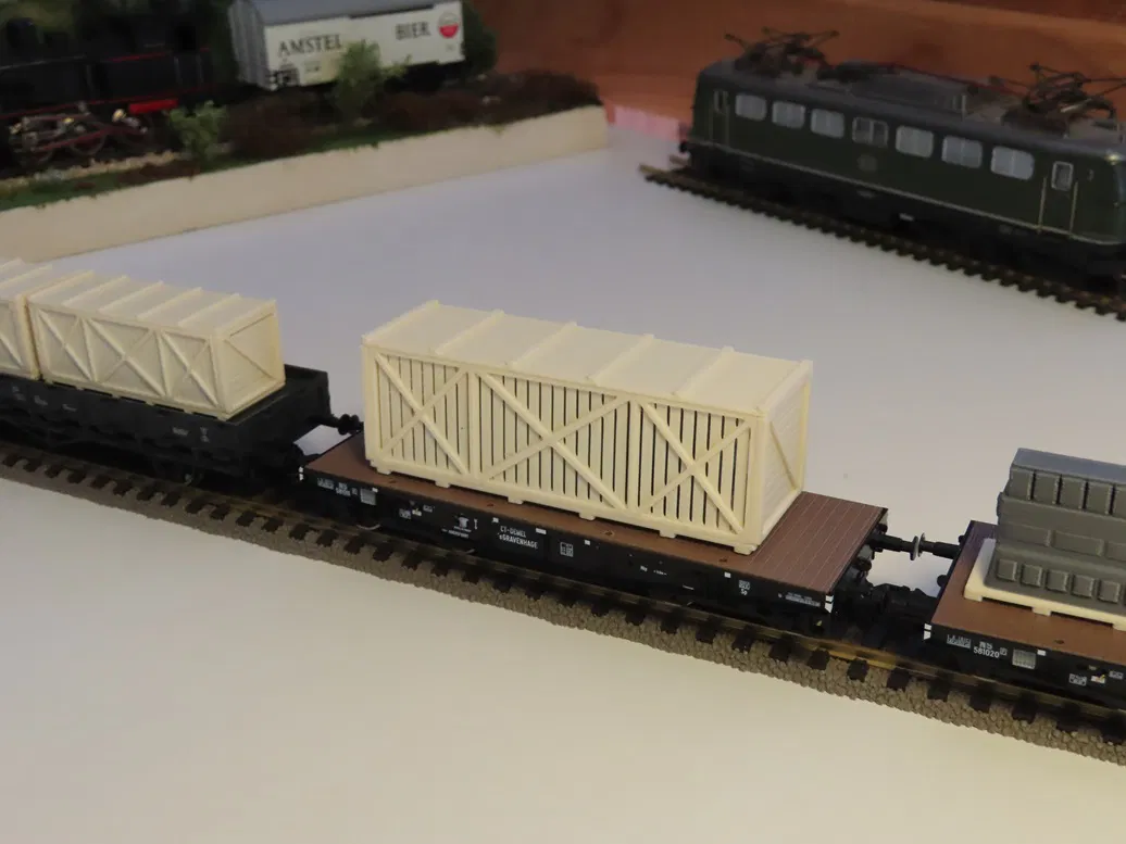 - Một thùng hàng nhỏ (mình đã đặt thử một bộ trên toa xe phẳng Piko 54318 loại UIC LW).