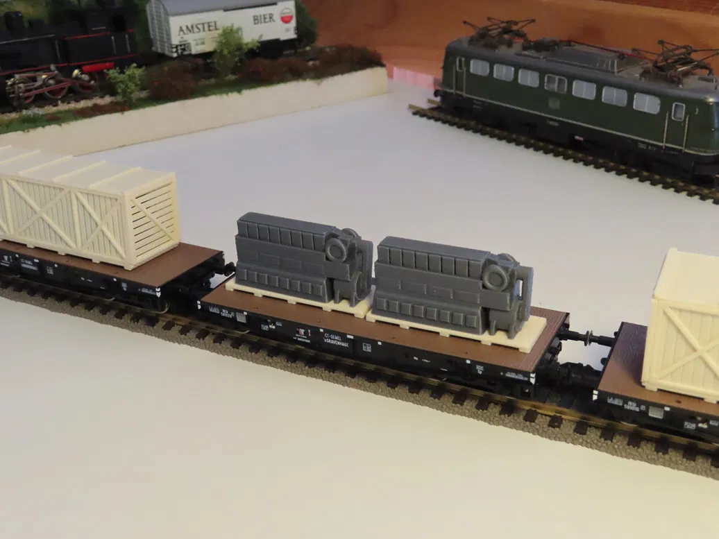 Bộ sưu tập bốn mẫu hàng hóa tải trọng nặng được thiết kế chi tiết tỉ lệ 1:87 H0, chuyên dụng cho các toa xe lửa phẳng UIC loại S, bao gồm động cơ Diesel, các loại thùng hàng và rotor động cơ điện công nghiệp cho mô hình tàu hỏa.