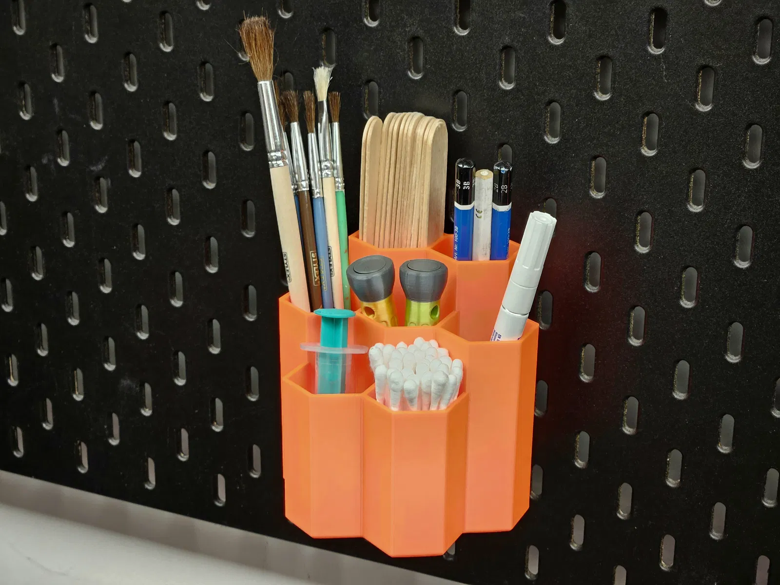 Sản phẩm này cực kỳ hữu ích cho những ai yêu thích mô hình, làm đồ handmade hoặc làm việc tại bàn giấy. Thay vì để dụng cụ nằm lăn lóc trên bàn gây bừa bộn và khó tìm, việc phân loại chúng vào từng ngăn lục giác giúp bạn thao tác nhanh chóng hơn nhiều. Đặc biệt, thiết kế thông minh này giúp bạn tận dụng tối đa diện tích dọc của bảng Skadis, giải phóng không gian bề mặt bàn làm việc một cách hiệu quả. Đây chắc chắn là món phụ kiện mà bất cứ ai dùng bảng treo IKEA đều nên in ngay để trang trí cho góc sáng tạo của mình.