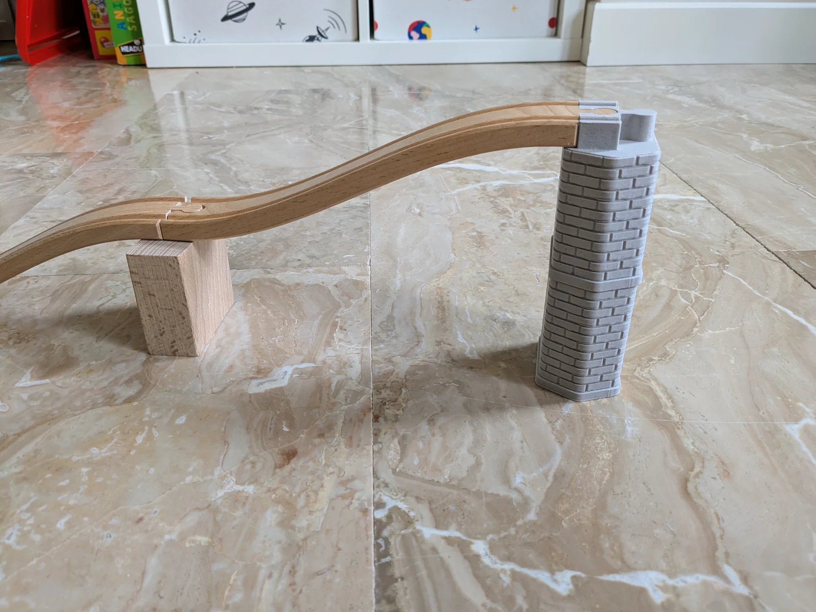 Trụ cầu có thể chồng tầng, tương thích hoàn hảo với các bộ đường ray gỗ như Ikea Lillabo và Brio. Thiết kế thông minh giúp mở rộng đường ray dễ dàng. Khuyên dùng nhựa in màu marble để có kết quả đẹp nhất.