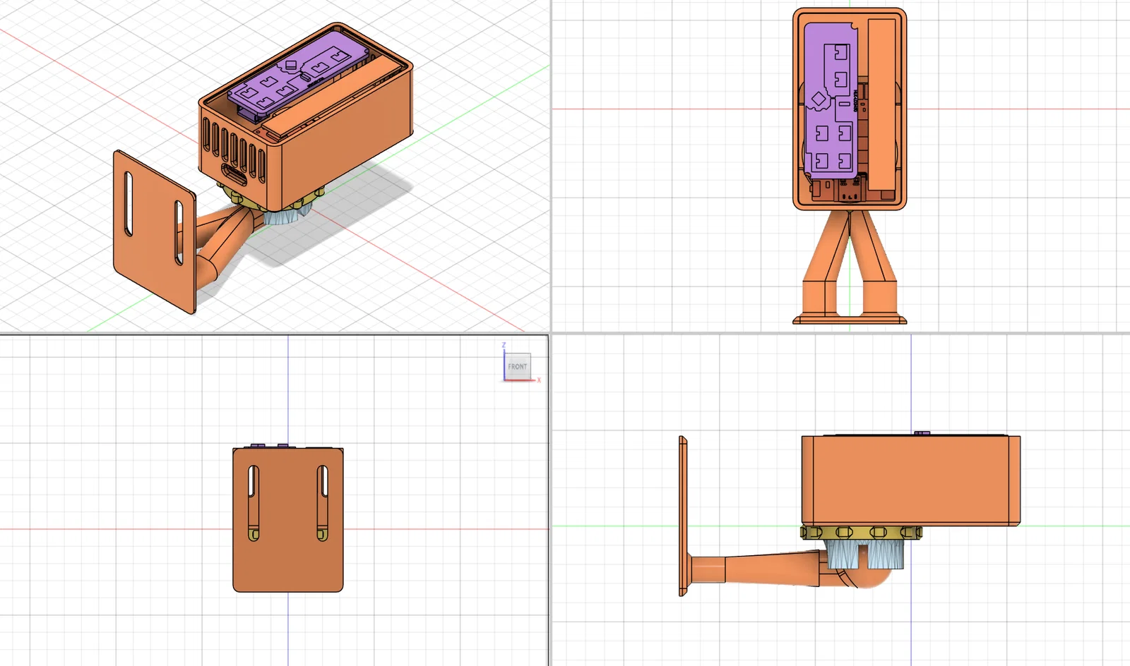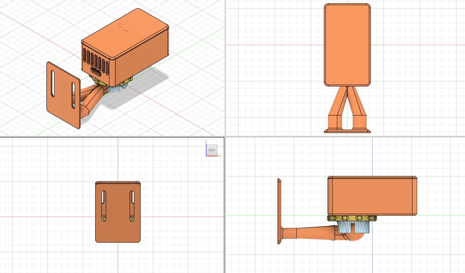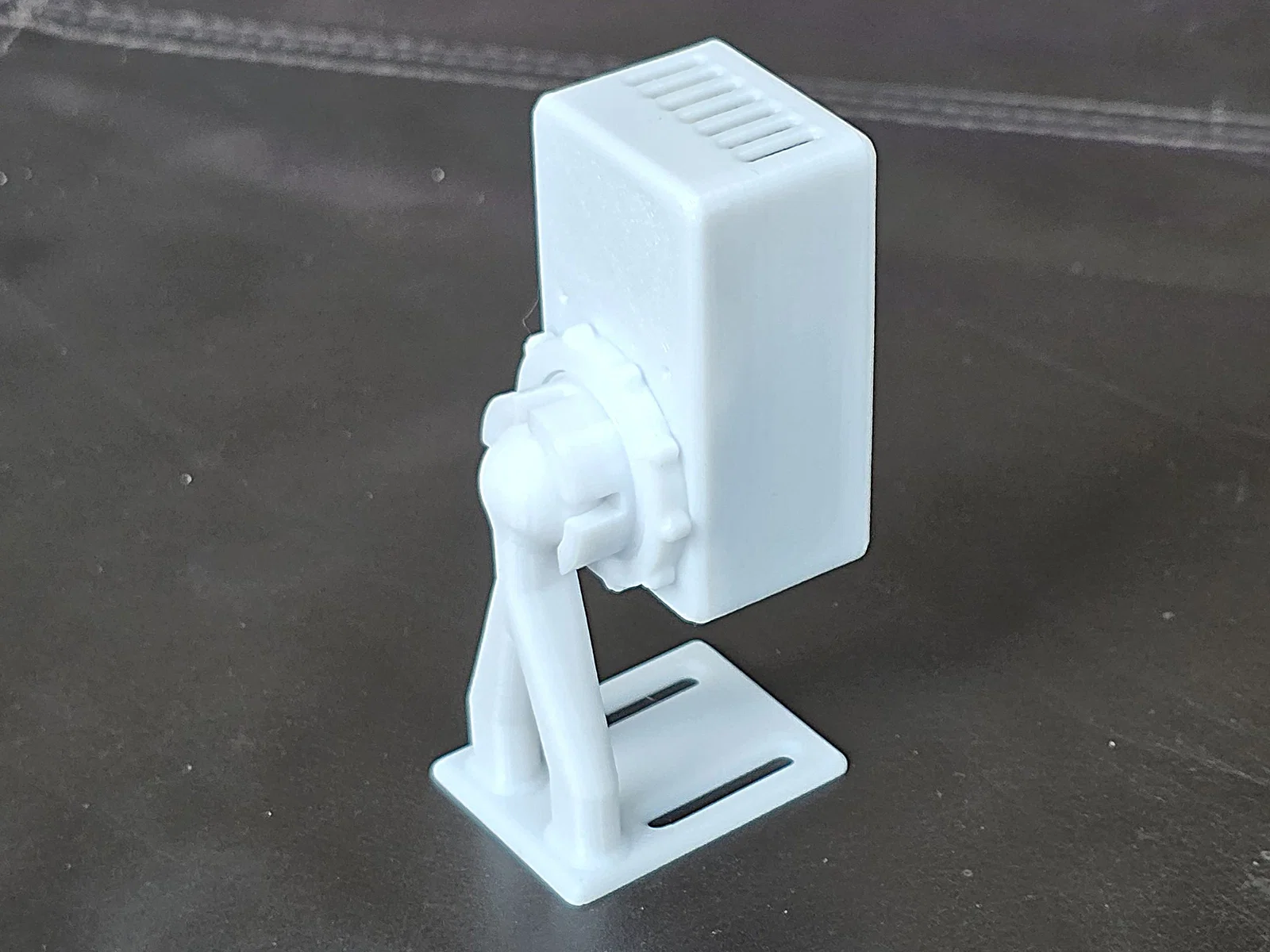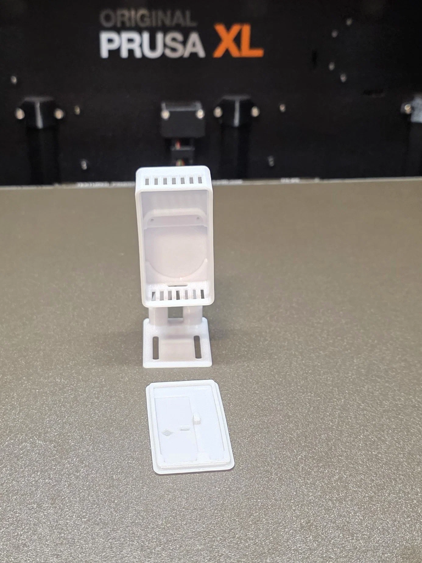 Cái hộp nhỏ gọn này được thiết kế riêng cho cảm biến radar LD2450 kèm anten Bluetooth và bo mạch ESP8266 Wemos D1 Mini V4. Mẫu thiết kế này lấy cảm hứng từ thiết kế cảm biến đa năng của F-Square, nhưng là một phiên bản phát triển mới hoàn toàn, ngoại trừ phần khớp cầu ở phía sau. Bạn không cần phải hàn cảm biến radar hay bo mạch ESP vì bên trong đã có sẵn chỗ để gắn các đầu nối. Bo mạch ESP được gắn vào hộp bằng cách khớp nối và có thể cố định thêm bằng vít M2 nếu cần. Cảm biến radar và anten Bluetooth được đặt vào nắp và cố định bằng một đoạn sợi nhựa in (filament). Nắp hộp sẽ tự khớp chặt vào thân khi đóng lại. Hộp có các khe thông gió ở trên và dưới để thoát nhiệt tốt hơn. Chân đế được thiết kế đủ rộng để luồn vừa các loại cáp USB-C thông dụng.