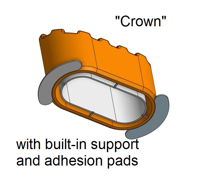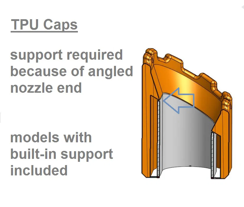 Phần nắp TPU có đế rất mỏng nên cần hỗ trợ (support) để in chuẩn. Mình đã thêm các mẫu có sẵn support và miếng đệm bám dính để giảm thiểu lãng phí vật liệu. Phần support này có thể bóc ra dễ dàng sau khi in xong. Các phiên bản không có support cũng được bao gồm, nhưng không khuyến khích dùng.