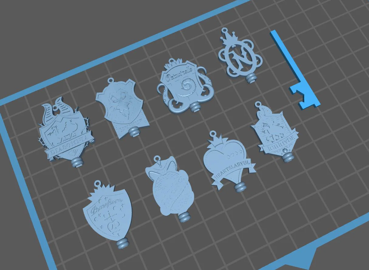 Mấy bộ trang phục trông đẹp quá đi! Mỗi nhân vật sẽ có một chìa khóa NRC và một chìa khóa ký túc xá đi kèm với bộ đồng phục Blazing Jewels. Các mẫu này được thiết kế chuyên dụng cho máy in MSLA. Nhớ in bằng nhựa resin nha! Dành cho các bạn cosplayer: Hãy in ở tỉ lệ 125% để các chìa khóa trông nổi bật và bắt mắt hơn trên những chiếc áo khoác nhiều chi tiết nhé! NightRavenCollegeKeyHead x 1, DormKeyHead x 1, KeyBladeAll x 2. Cập nhật ngày 11/4/2025: Mình quên mất ký túc xá Ramshackle! Mình đã bổ sung thêm chìa khóa cho Grim & Yuu cùng với chiếc trâm cài đặt dưới ve áo bên phải rồi đó.