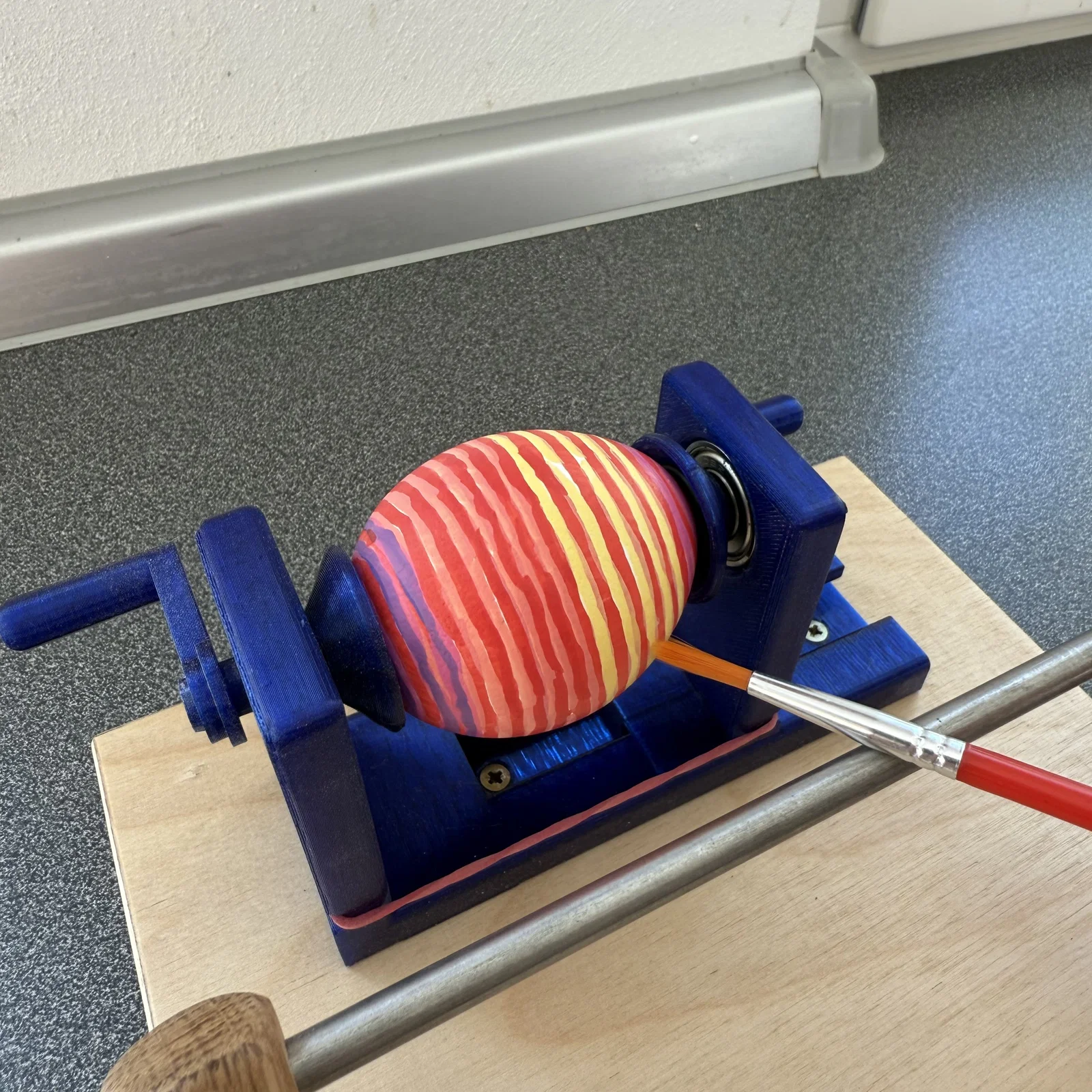 Cuối cùng, mình lắp toàn bộ dụng cụ lên một tấm ván nhỏ kèm theo giá đỡ bút và cọ để máy đứng vững chãi hơn, giúp bạn tập trung trang trí trứng thật đẹp.