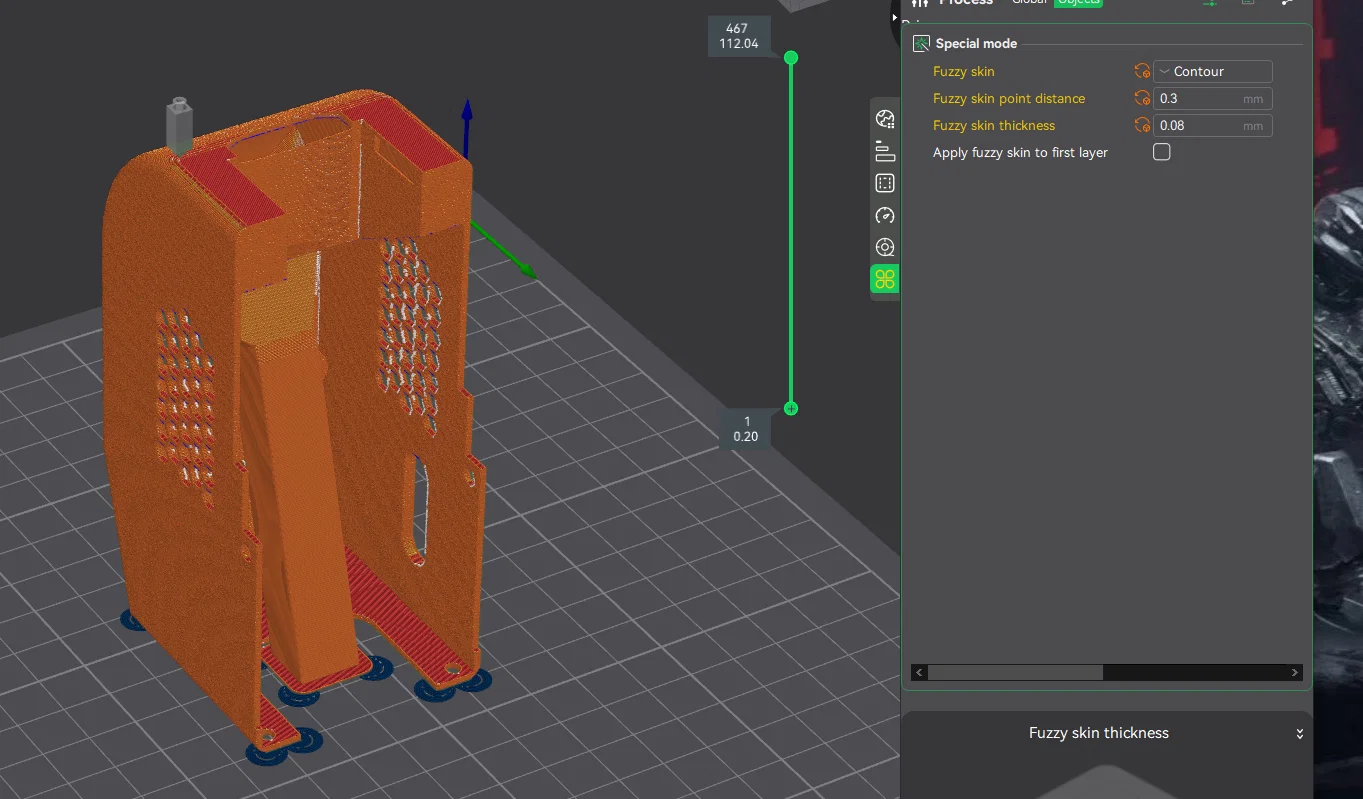 - (tùy chọn) Fuzzy skin - 0.3 khoảng cách điểm, 0.08 độ dày