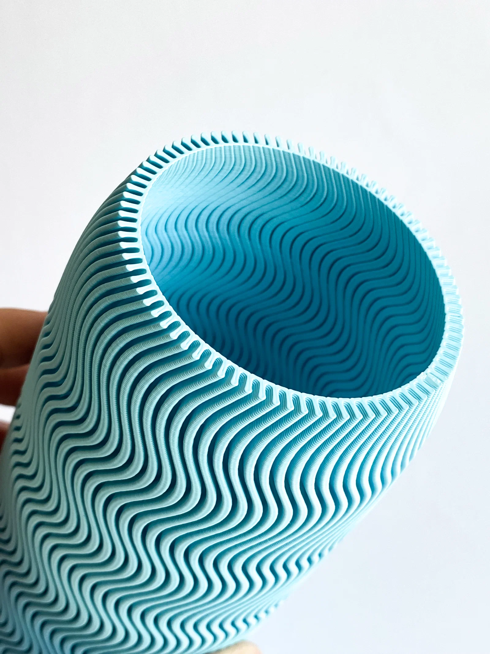 Việc in 3D mẫu bình họa tiết sóng này không chỉ là quá trình tạo ra một vật dụng trang trí, mà còn là dịp để bạn thử nghiệm và tận dụng tối đa khả năng của máy in 3D cá nhân. Hãy chọn những cuộn nhựa có màu sắc bắt mắt như màu xanh pastel như trong hình để món đồ decor của bạn thêm phần nổi bật nhé!