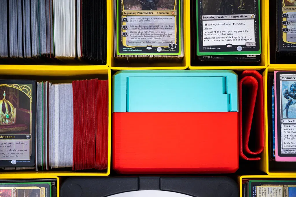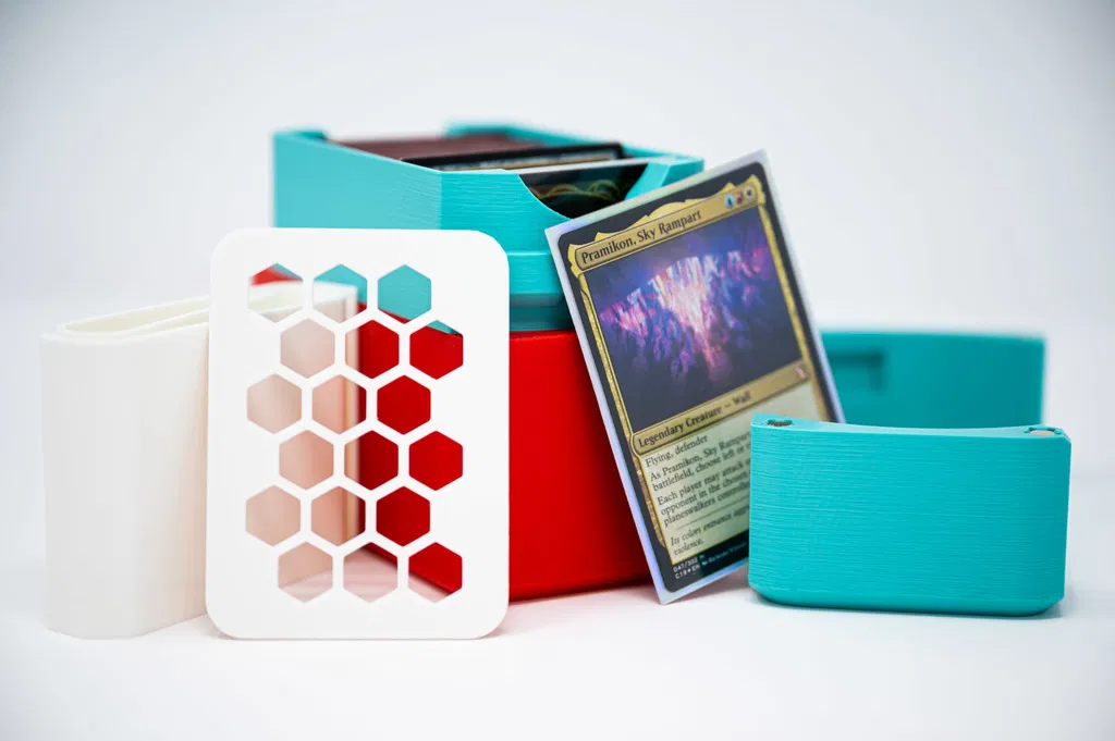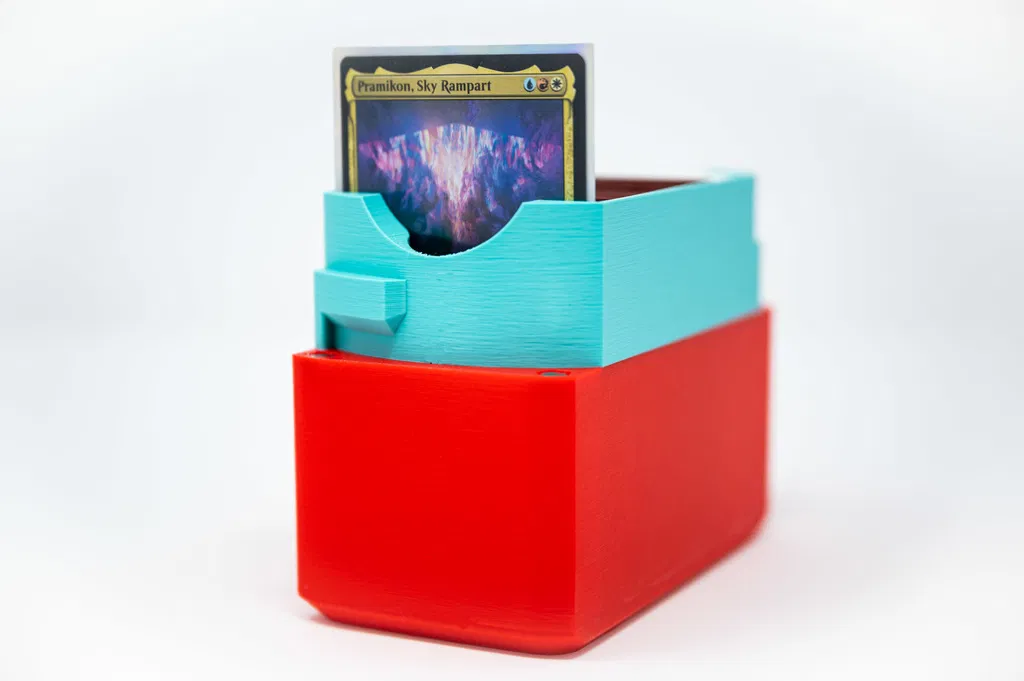 Hộp đựng bài cỡ Commander này sẽ giữ cho các lá bài của bạn an toàn trong túi xách hoặc làm một chiếc hộp độc lập hoàn hảo cho những ngày đi hội bài. Được thiết kế với tiêu chí bền bỉ, ngăn chính có kích thước đủ chứa các lá bài được bọc hai lớp (double-sleeved) cùng một lượng lớn bài token hoặc các lá bài bọc một lớp. Lò xo nén bài đi kèm sẽ giữ các lá bài nằm gọn trong hộp, ngăn chúng bị xô lệch khi di chuyển. Tất cả các bộ phận của hộp đều được thiết kế để dễ in ấn, bạn hoàn toàn có thể in tất cả mà không cần dùng đến support.