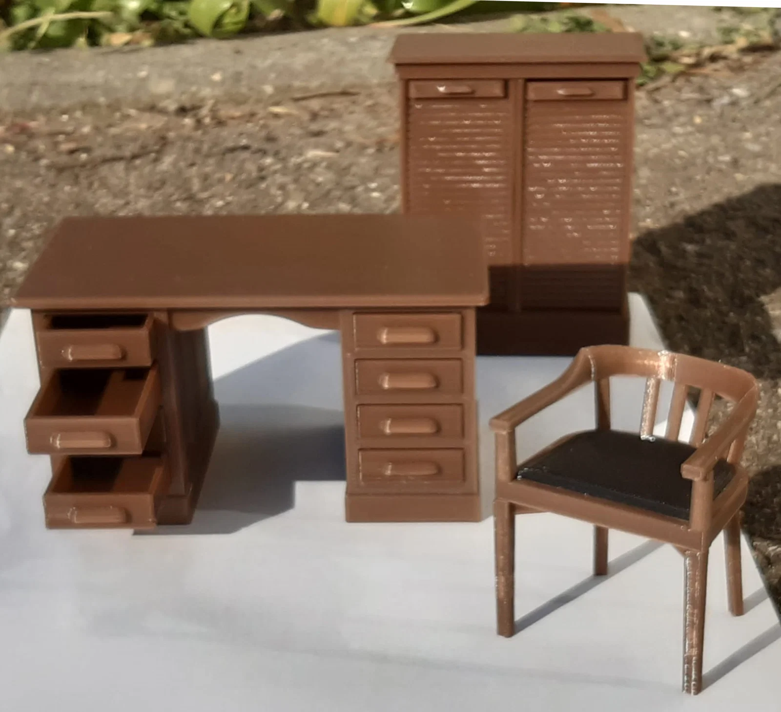 Đây là mô hình bàn làm việc kèm ghế dựa theo bàn thật của mình với tỷ lệ 1:12. Bạn có thể tìm thấy chiếc tủ có cửa cuốn đi kèm tại đây:
