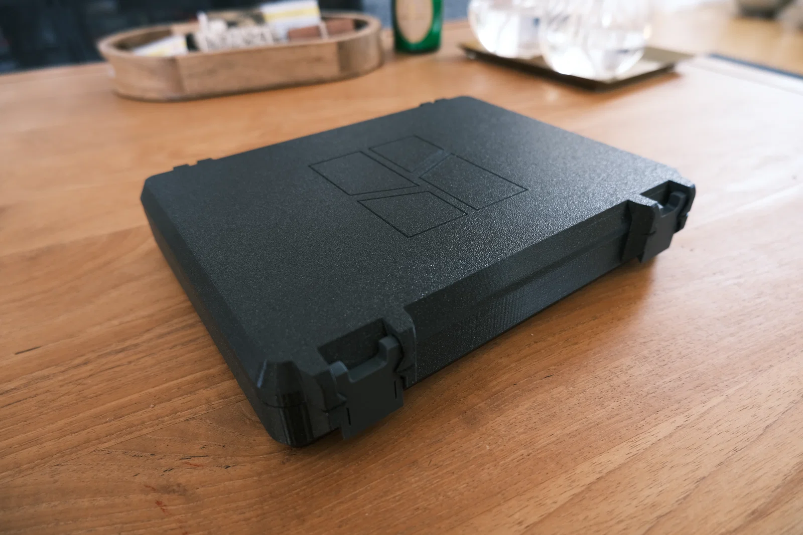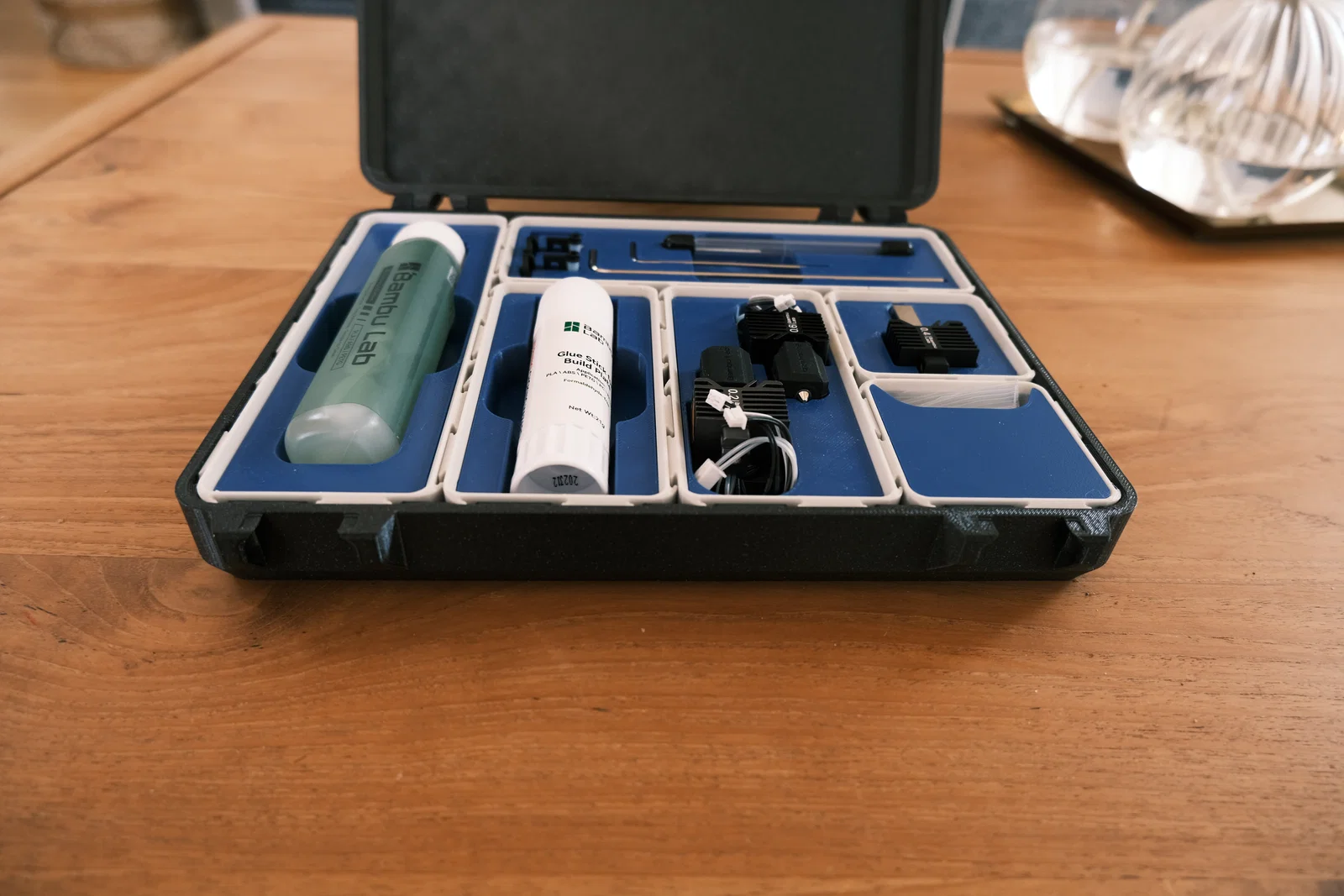 Mình thiết kế một chiếc hộp có logo Bambulab, bên trong có thể chứa được nhiều khay nhỏ. Những chiếc khay này được thiết kế chuyên biệt để đựng các phụ kiện như đầu in (print head), keo dán và nhiều vật dụng khác.