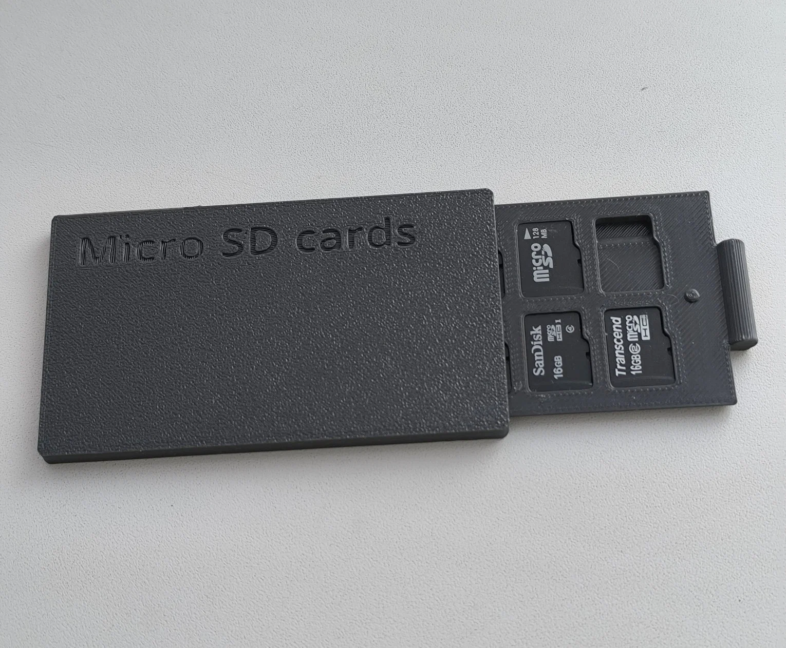 Cái hộp này hơi khó mở một chút, có lẽ nên chỉnh lại phần lẫy khóa xuống còn 0.4 mm thay vì 0.5 mm thì sẽ ổn hơn. Thẻ nhớ cắm vào rất khít, chắc chắn, không sợ bị rơi rớt ra ngoài như mấy mẫu khác. Trong hình là mẫu được in bằng nhựa PETG, sử dụng đầu phun 0.4 mm và độ cao lớp in là 0.2 mm.