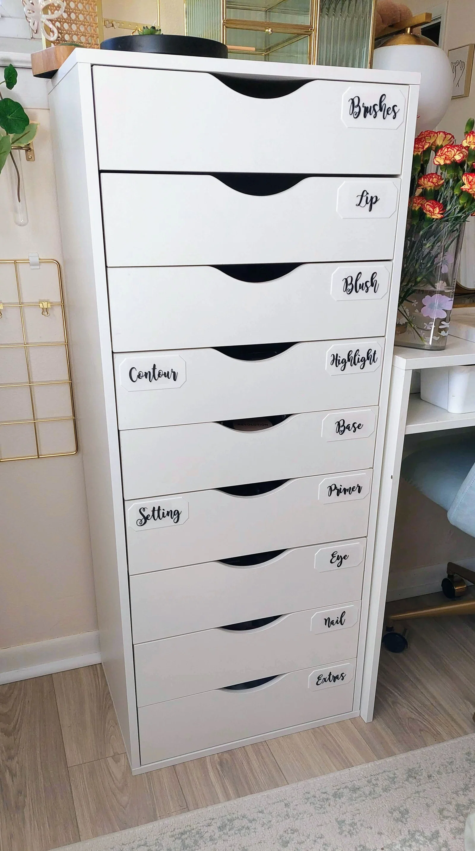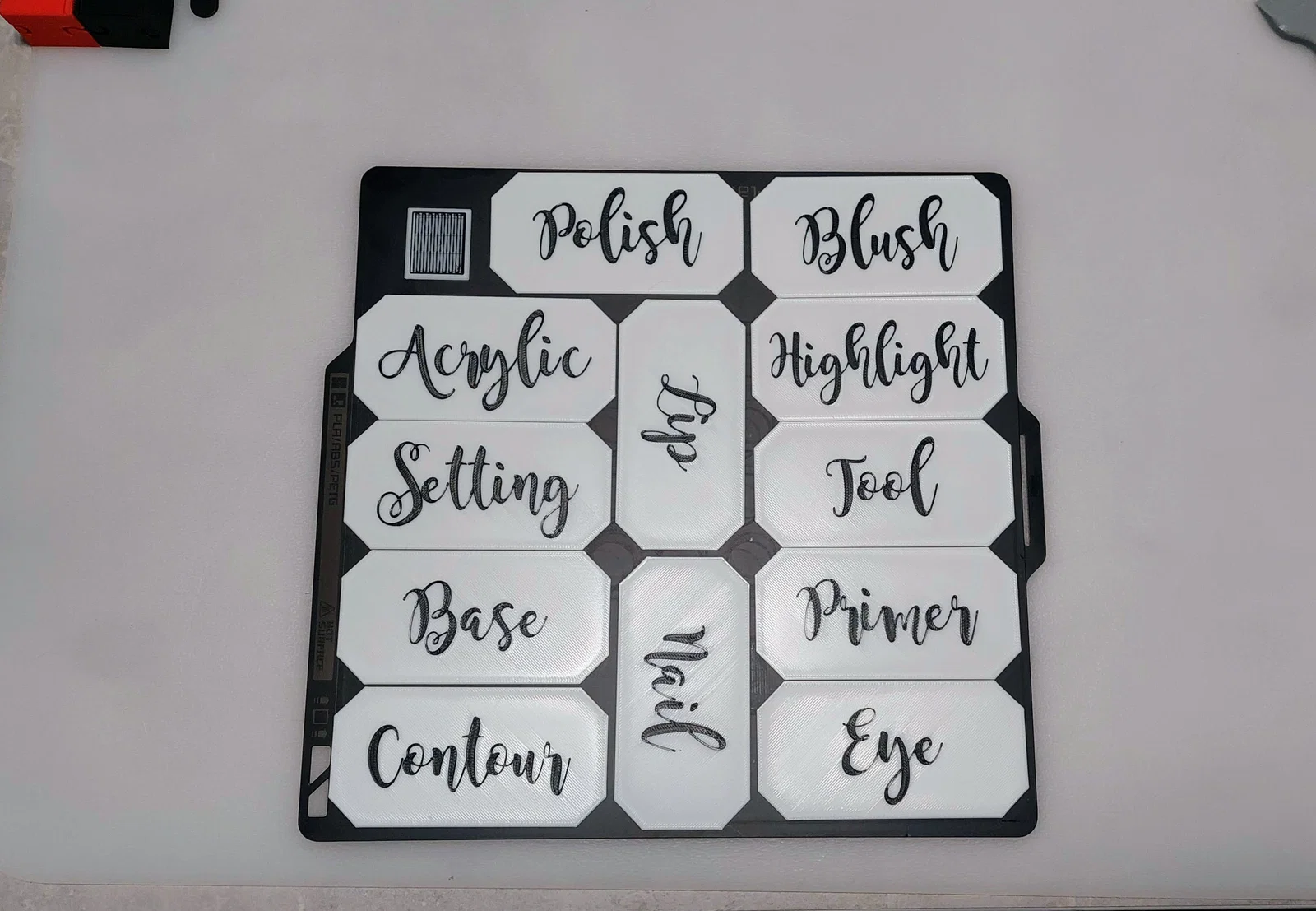 Con gái mình đang sắp xếp lại mấy ngăn kéo đựng đồ trang điểm và muốn dán nhãn lên đó. Mình đã tạo ra tấm bảng trắng (blank plaque) này rồi dùng phần mềm slicer để in nổi chữ lên trên.