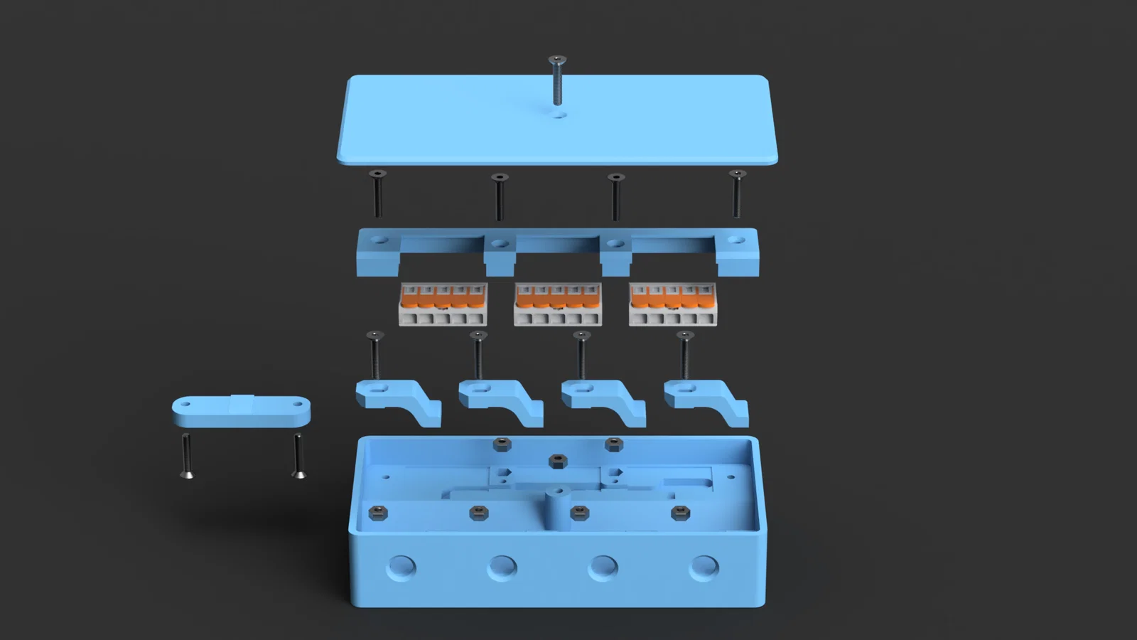 Hộp đấu nối điện tiện lợi, thay thế ổ cắm truyền thống, thích hợp lắp dưới gầm bàn hoặc góc làm việc. Hỗ trợ WAGO 221-415, giúp quản lý dây cáp gọn gàng cho PC và thiết bị. Yêu cầu in PETG V0 để đảm bảo an toàn chống cháy.