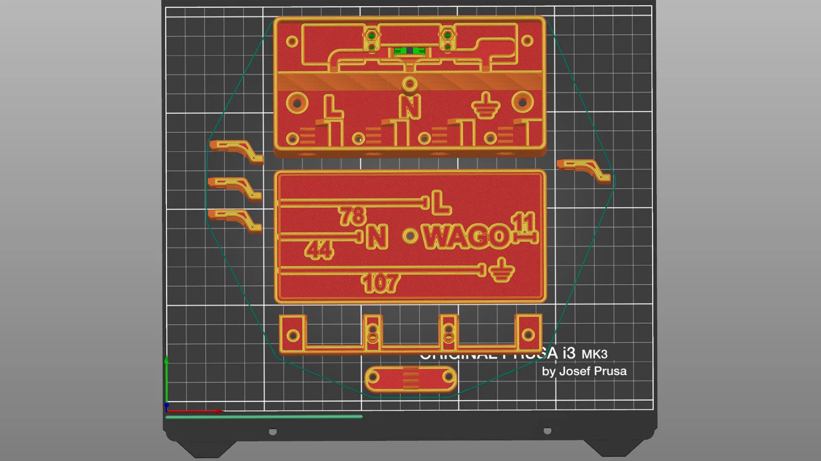 Tôi in bằng Prusament PETG V0, nozzle 0.60mm, layer 0.30mm, 3 vách (walls), infill 100% cho các loại kẹp, infill 5% cho hộp và 0% cho các phần còn lại.