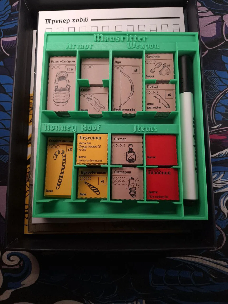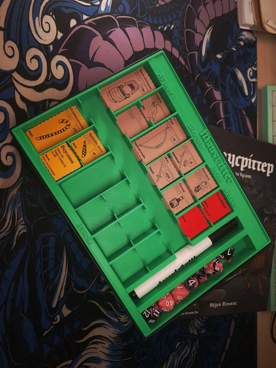 Khay này tận dụng toàn bộ diện tích bên trong hộp, có không gian chứa các token từ game chính và một phần không gian tương đương cho các bản mở rộng (addons). Ngoài ra, còn có chỗ để một bộ 7 viên xúc xắc và một cây bút lông (sharpie).