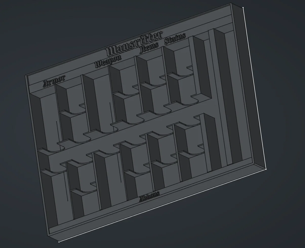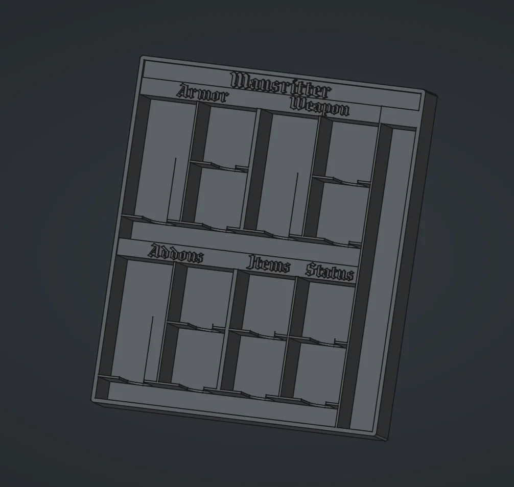 Khay đựng tiện lợi được thiết kế vừa vặn trong hộp game Mausritter, giúp sắp xếp gọn gàng tất cả token, các bản mở rộng, bộ xúc xắc và bút lông. Sản phẩm bao gồm cả file CAD cho cả hai phiên bản khay.