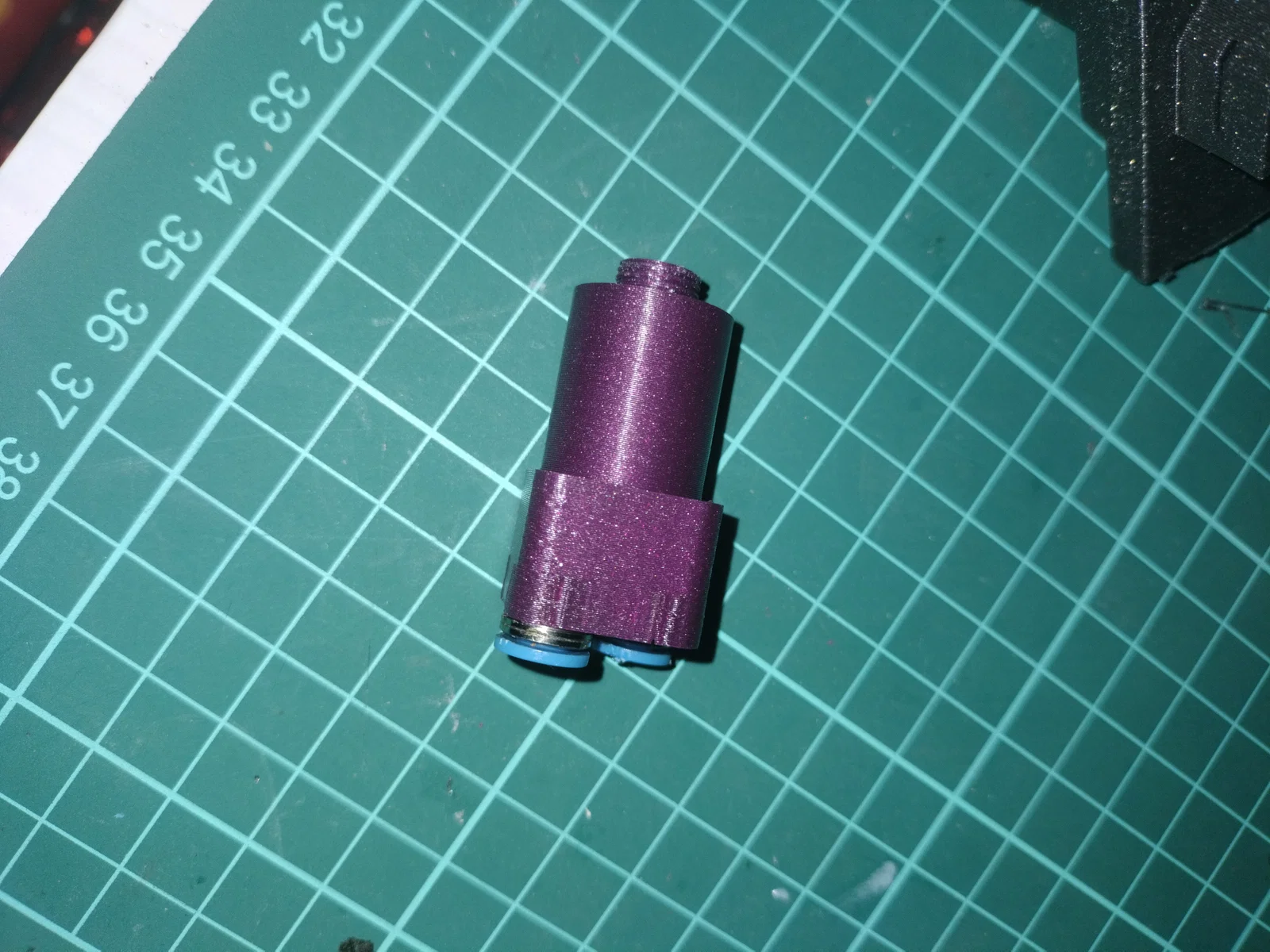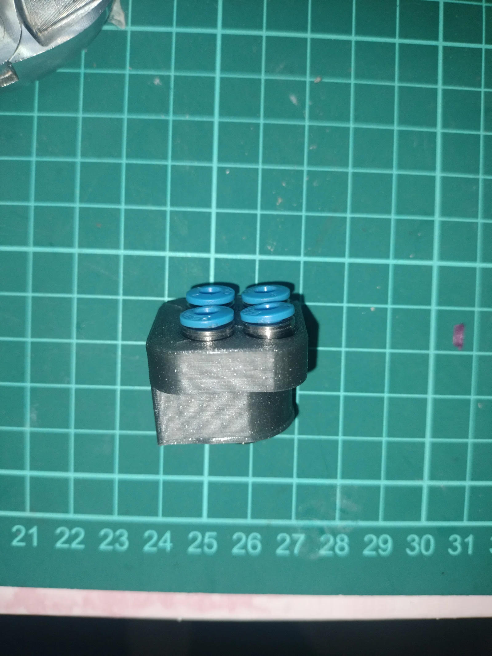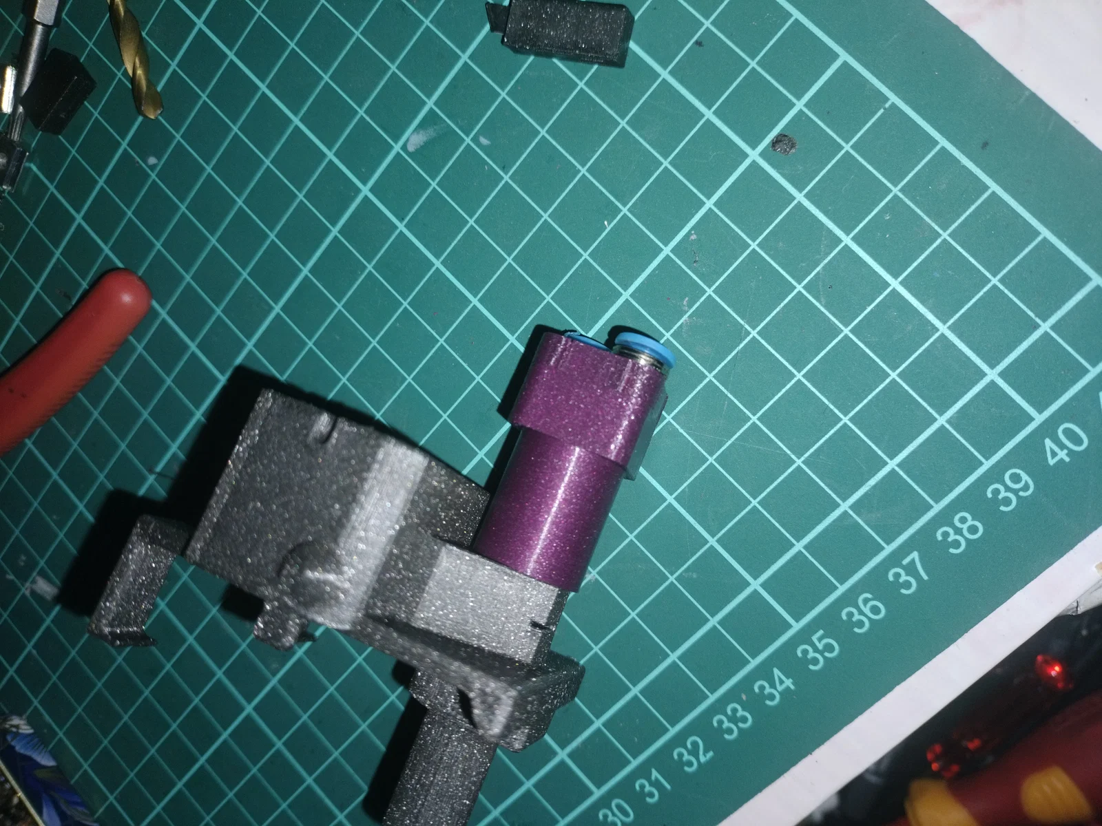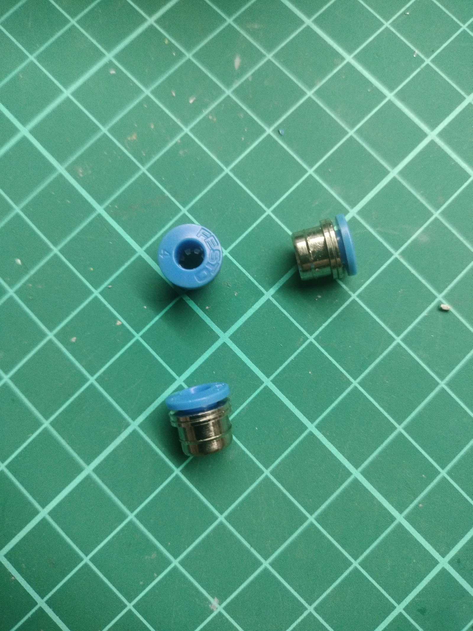 Để cố định các ống PTFE, mình dùng đầu nối kim loại tận dụng từ khớp nối nhanh Festo cũ (loại có vỏ nhựa, chỉ cần tháo bỏ lớp vỏ nhựa là lấy được đầu nối ra). Loại này nhỏ gọn và nhẹ. Bạn nên dùng ê-tô để ép đầu nối vào, đừng dùng búa kẻo bị hỏng (giống mình từng bị).