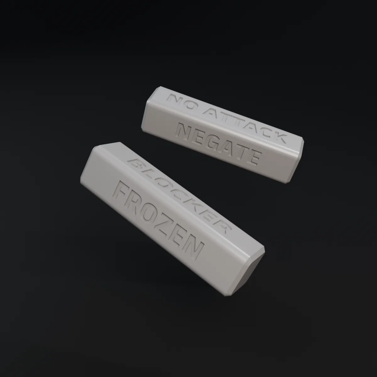 Mẫu này bao gồm các thanh với kích thước nhỏ gọn chỉ 12x12x48 mm, rất vừa vặn để đặt lên thảm chơi mà không làm vướng víu không gian chiến thuật. Thiết kế dạng khối trụ có các mặt dẹt giúp thanh nằm vững trên mặt bàn, chữ được khắc chìm tinh tế, giúp anh em dễ dàng đọc được từ mọi hướng. Đây là một món phụ kiện in 3D cực kỳ hữu ích, giúp nâng cao trải nghiệm chơi game và hạn chế tranh cãi trong các pha xử lý kỹ năng quan trọng.