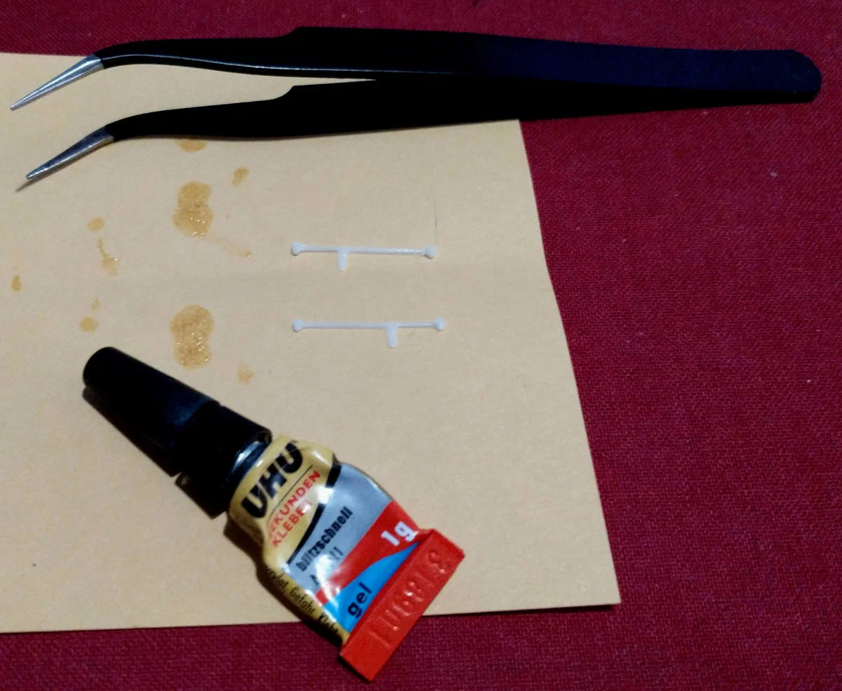 Bạn nhỏ một giọt keo dán sắt lên một tờ giấy, sau đó dùng nhíp cẩn thận chấm phần mặt phẳng của thanh khóa vào giọt keo (chỉ chấm phần đầu thanh) rồi đặt chúng lên cửa container (phía có hoa văn nổi bật hơn) - có một khoảng trống được thiết kế để khớp với tay cầm. Xem hình ảnh phía trên để biết chi tiết.