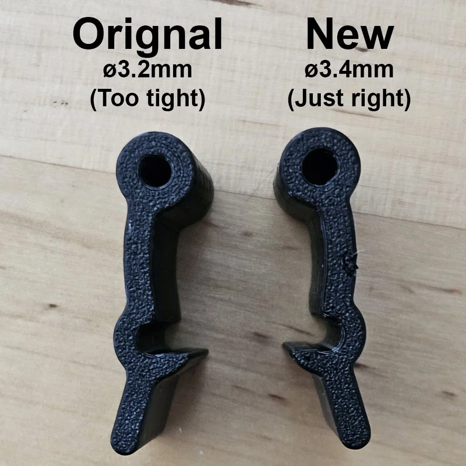 Độ dung sai (tolerance) của các chốt khóa gốc hơi bị chặt đối với máy in FDM. Đường kính lỗ chỉ có 3.2mm (khít), mà ngay cả máy Bambu P1S của mình cũng không thể in chính xác được mức dung sai đó. Kết quả là khi xoay chốt, nó làm xoay luôn cả con ốc bên trong case, gây ra tình trạng mòn case không cần thiết. Mình đã tăng đường kính lỗ lên thành 3.4mm (vừa vặn), giúp chốt xoay tự do hơn và việc lắp ráp cũng dễ dàng hơn nhiều :).