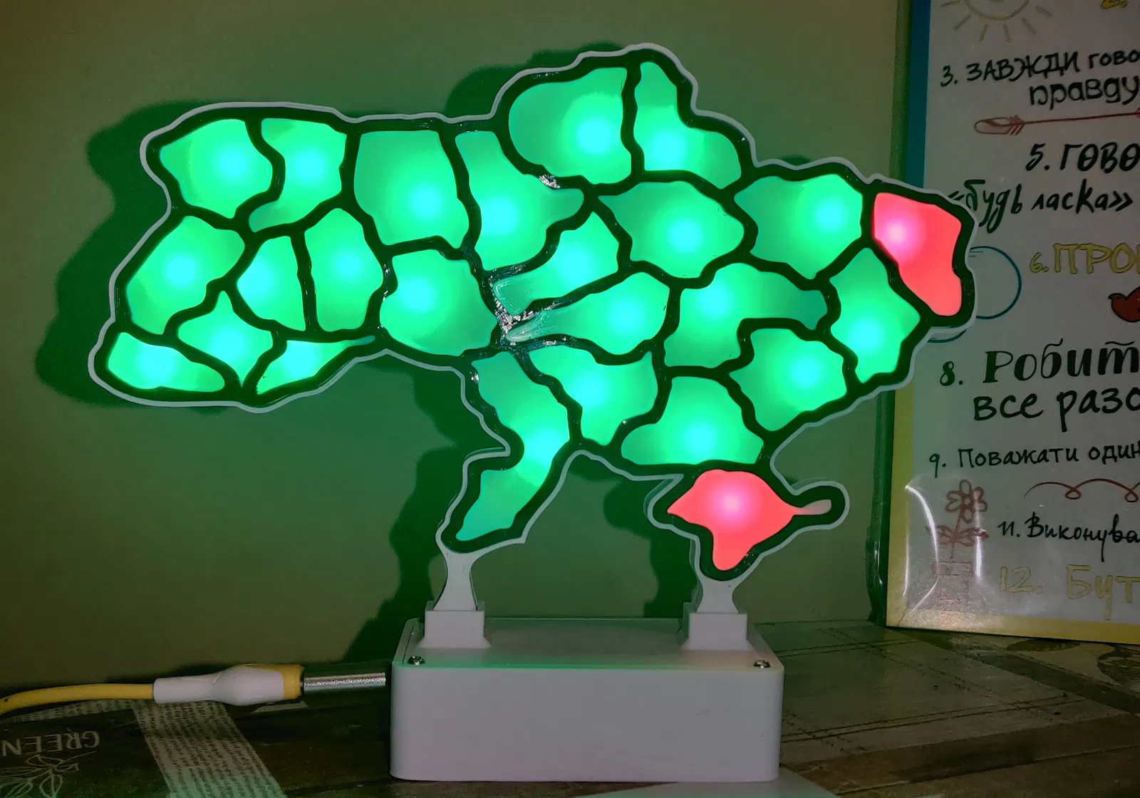 Đây là một dự án in 3D kết hợp với công nghệ điện tử vô cùng thú vị và đầy ý nghĩa. Mô hình được thiết kế để hiển thị trạng thái báo động tại các khu vực khác nhau của Ukraine thông qua hệ thống đèn LED thông minh. Với cấu trúc bản đồ được chia nhỏ từng vùng, sản phẩm không chỉ là một vật phẩm trang trí để bàn ấn tượng mà còn là công cụ trực quan giúp người dùng theo dõi thông tin cập nhật theo thời gian thực một cách dễ dàng và thẩm mỹ.