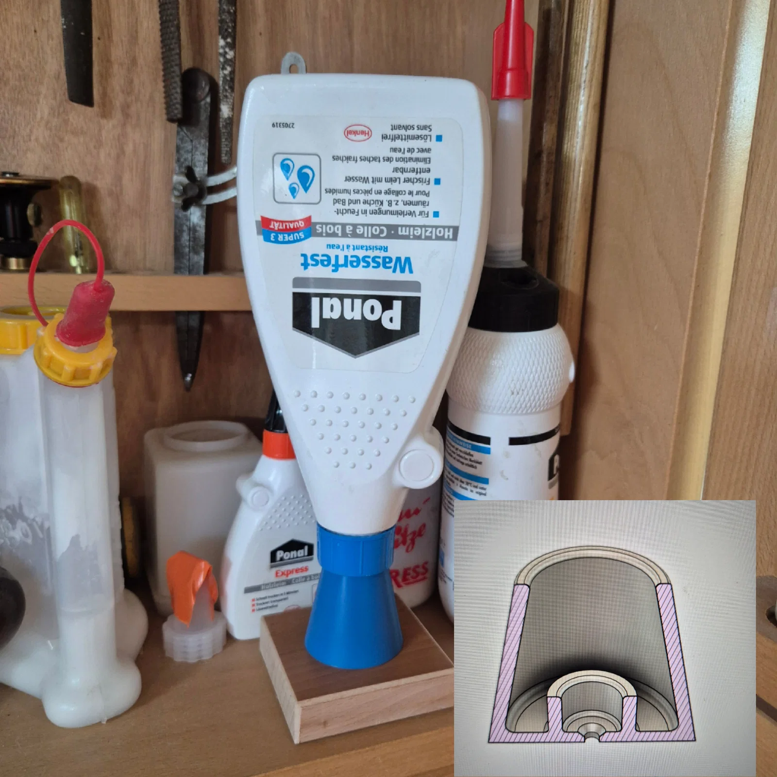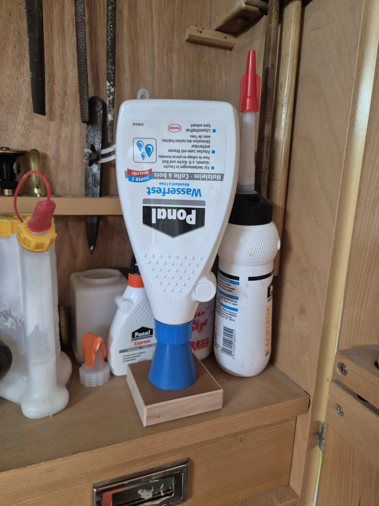 Với chiếc đế này, bạn có thể dựng ngược chai keo lên. Nhờ vậy, ngay cả khi chai sắp hết, keo vẫn luôn nằm sẵn ở miệng chai, giúp bạn dán đồ mà không phải chờ đợi hay khó chịu. Để đế thêm vững chãi, bạn có thể bắt vít nó lên một miếng gỗ nhỏ. Bạn chỉ cần dùng một con vít đầu chìm 3mm cho việc này. ##### Nếu thấy hữu ích, hãy để lại một Like, Make hoặc bình luận cho mình nhé!