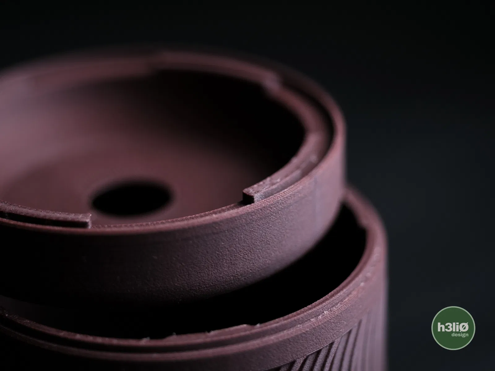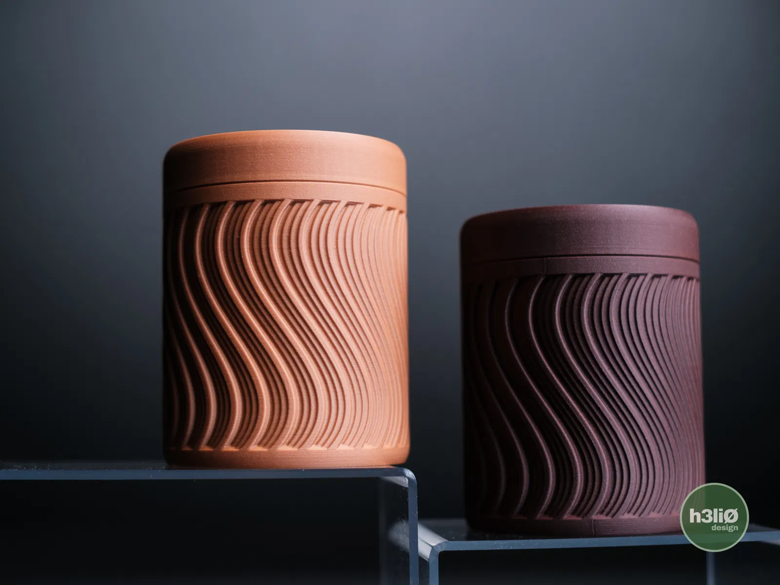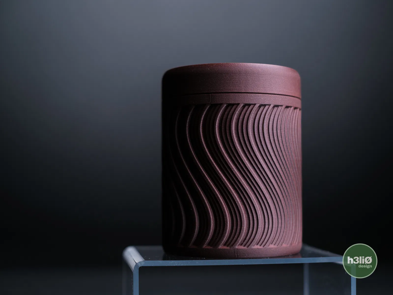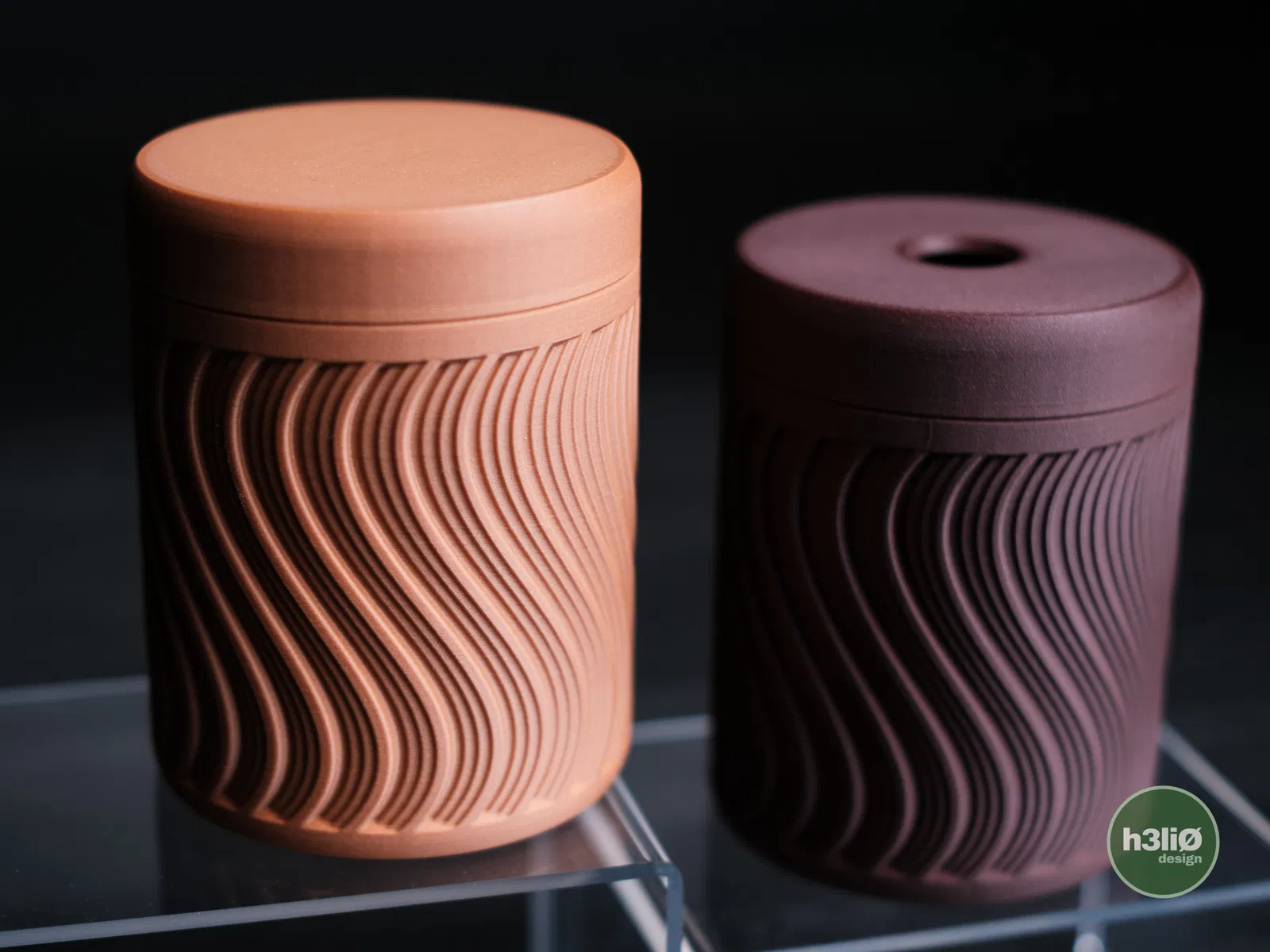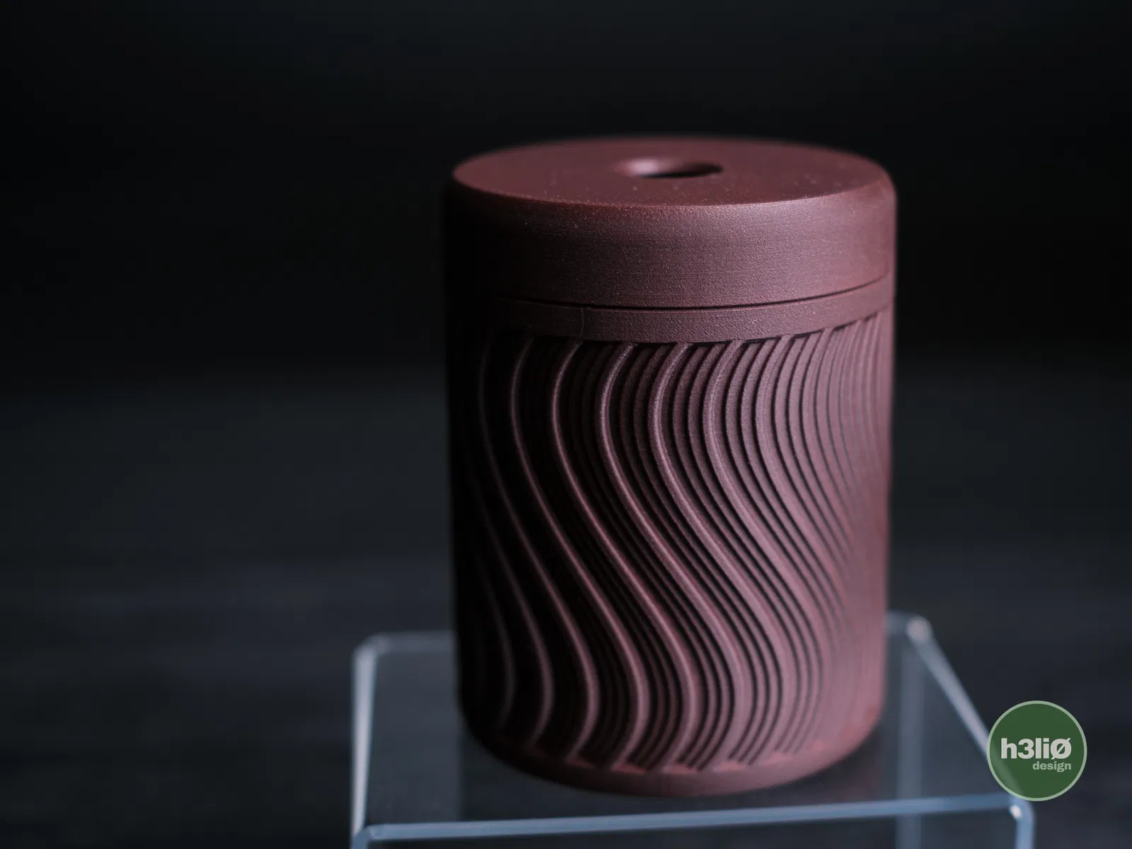 Thiết kế hộp đựng tối giản, hiện đại với nắp xoay khóa. Đi kèm hai tùy chọn nắp: loại kín và loại có lỗ ở giữa (ví dụ có thể dùng để đựng heets).