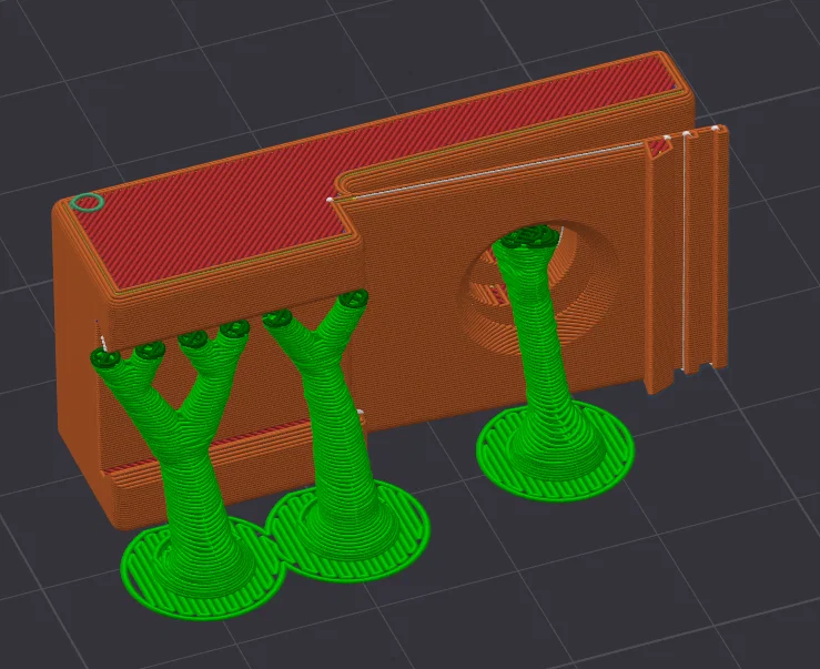 File này đã được xoay sẵn ở hướng in tối ưu. Bạn sẽ cần bật chế độ hỗ trợ (supports), nhưng mỗi cái ngàm in ra tốn rất ít support. Mình khuyên dùng tree supports vì nó rất dễ gỡ. Với mình thì dùng infill gyroid 15% là đã đủ chắc chắn rồi.