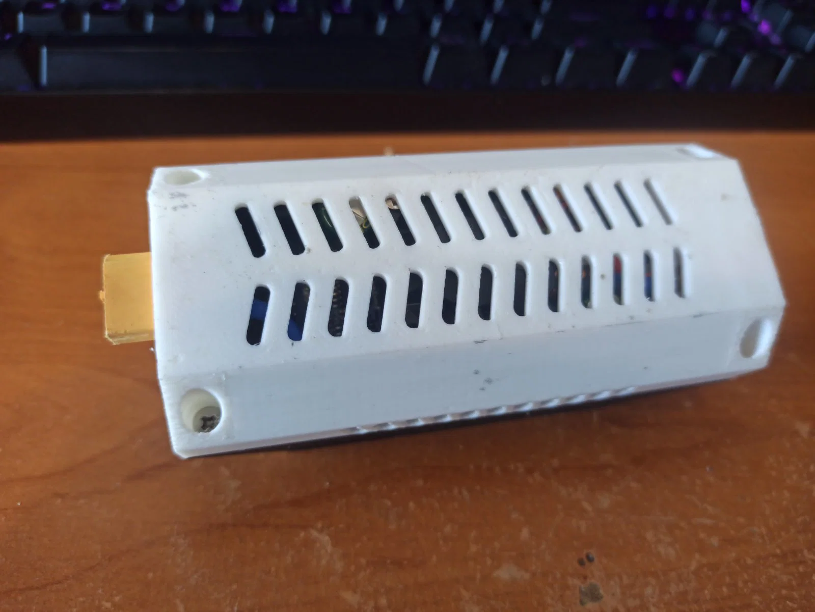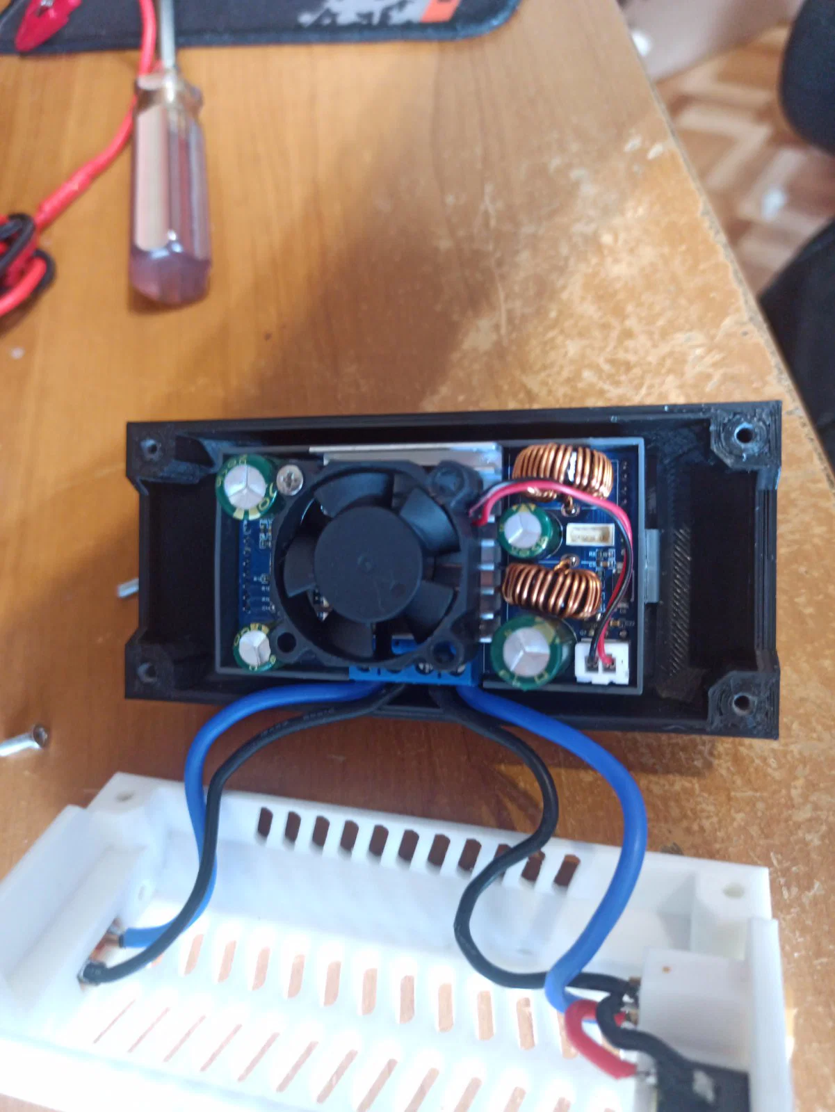 Mẫu này là bản remix từ https://www.thingiverse.com/thing:2975884/remixes. Tôi đã cải thiện các lỗ thông gió ở mặt sau vì thiết kế cũ làm nguồn bị quá nhiệt. Tôi cũng đã loại bỏ các cổng cắm banana ở đầu ra và chỉ giữ lại cổng XT-60. Tôi dùng jack banana 3.5mm vì nó vừa khít với cổng XT-60. Phần vỏ trên được in bằng nhựa màu đen, còn phần dưới in màu trắng.