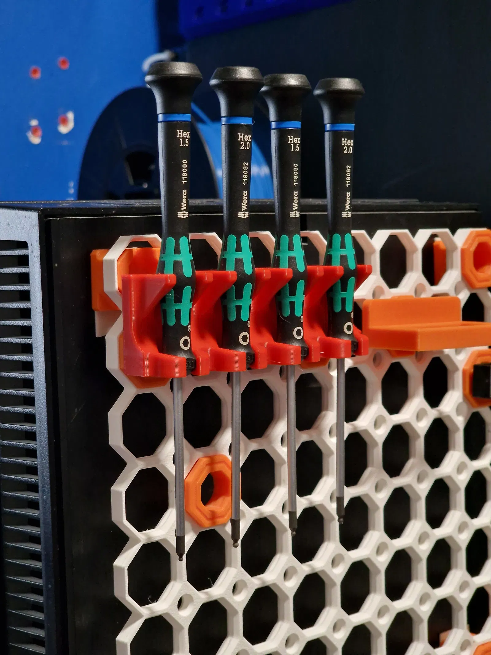 Nếu anh em đang sở hữu bộ tua vít Wera Kraftform Micro và muốn góc làm việc của mình gọn gàng, chuyên nghiệp hơn thì đây chính là món phụ kiện không thể thiếu. Mẫu thiết kế này được làm riêng để gắn kết hoàn hảo với hệ thống Multiboard phổ biến hiện nay. Thay vì để tua vít lăn lóc trên bàn gây trầy xước hoặc khó tìm kiếm mỗi khi cần, anh em chỉ cần in mẫu giá treo này và gắn lên bảng. Việc sắp xếp công cụ một cách khoa học sẽ giúp anh em tiết kiệm được kha khá thời gian và tập trung tối đa cho công việc sửa chữa hoặc lắp ráp thiết bị điện tử của mình.