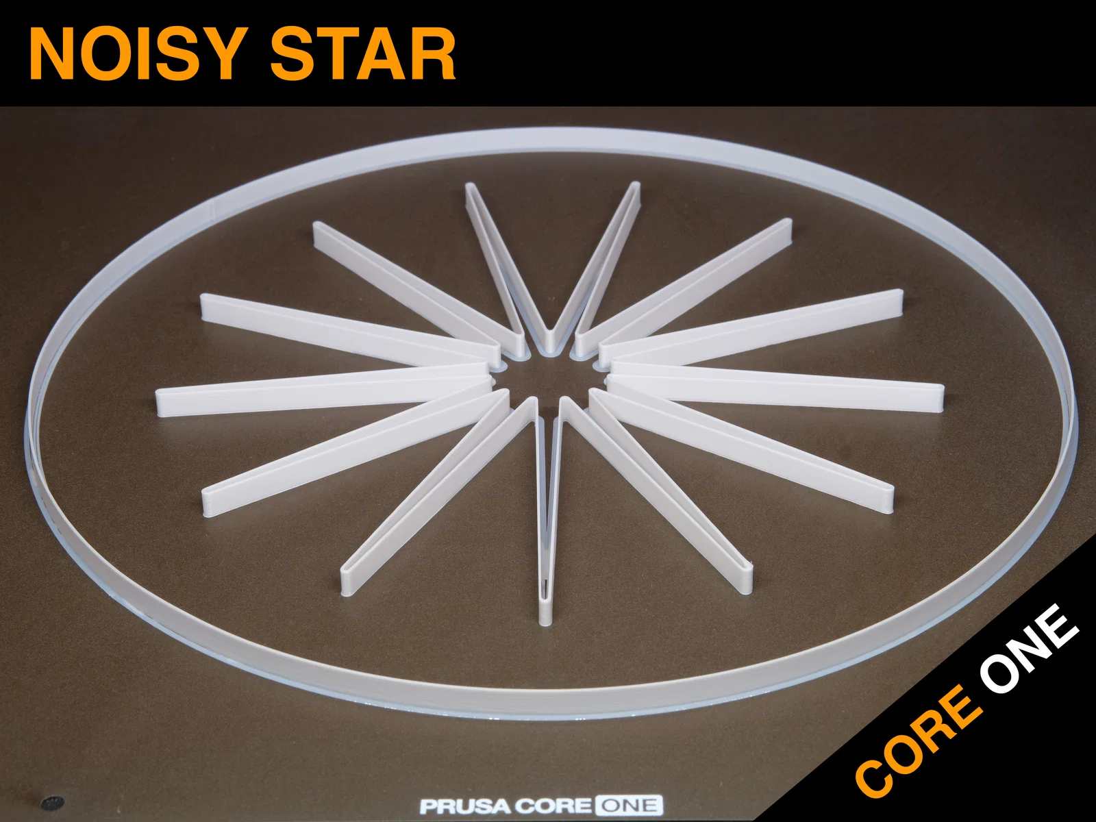 Mẫu in Noisy Star giúp kiểm tra độ ồn của máy in Core One khi hoạt động ở tốc độ cao. Thiết kế bao gồm các họa tiết ngôi sao và hình tròn để mô phỏng chính xác sự kết hợp chuyển động của trục X và Y trong quá trình vận hành.