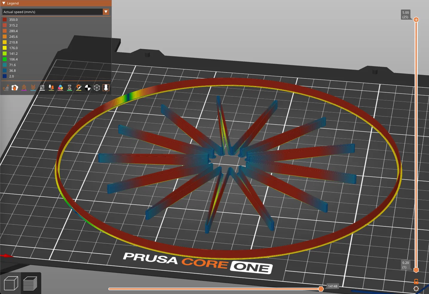 Noisy Star là một mẫu dùng để kiểm tra độ ồn của máy in Core One khi chạy ở tốc độ cao, nhưng bạn cũng có thể dùng nó để test các dòng máy in khác, đặc biệt là các máy sử dụng cấu trúc CoreXY. Các họa tiết hình ngôi sao và hình tròn đã được chọn lọc để làm nổi bật các sự kết hợp chuyển động khác nhau của trục X và Y trong quá trình in. File G-code đính kèm đã được thiết lập cho nhựa PLA ở tốc độ 350 mm/s (200 mm/s cho lớp đầu tiên) với đầu phun CHT (high flow) 0.4 mm. Đây là giới hạn tốc độ mặc định của Core One tại thời điểm mình tạo ra file này. Mặc dù Core One có thể in nhanh hơn nữa, nhưng đa số người dùng thường sẽ không vượt quá giới hạn tốc độ mặc định của máy, nên mình tin rằng thiết lập này khá phù hợp để làm chuẩn. Khi kiểm tra độ ồn, bạn nhớ tắt chế độ 'silent mode' nhé, vì chế độ này sẽ giới hạn tốc độ in và tốc độ di chuyển, đồng thời làm giảm tiếng ồn của máy in đấy.