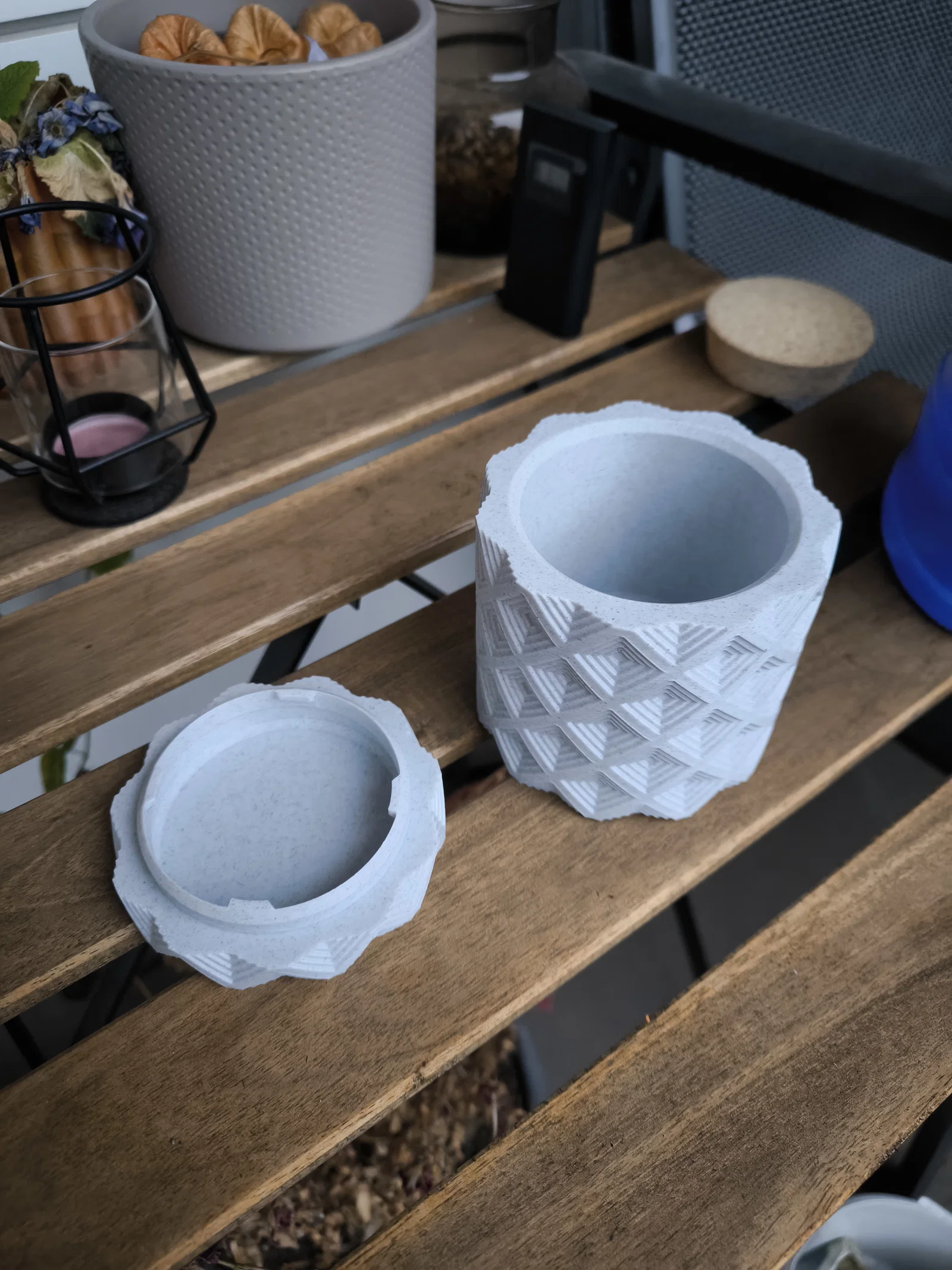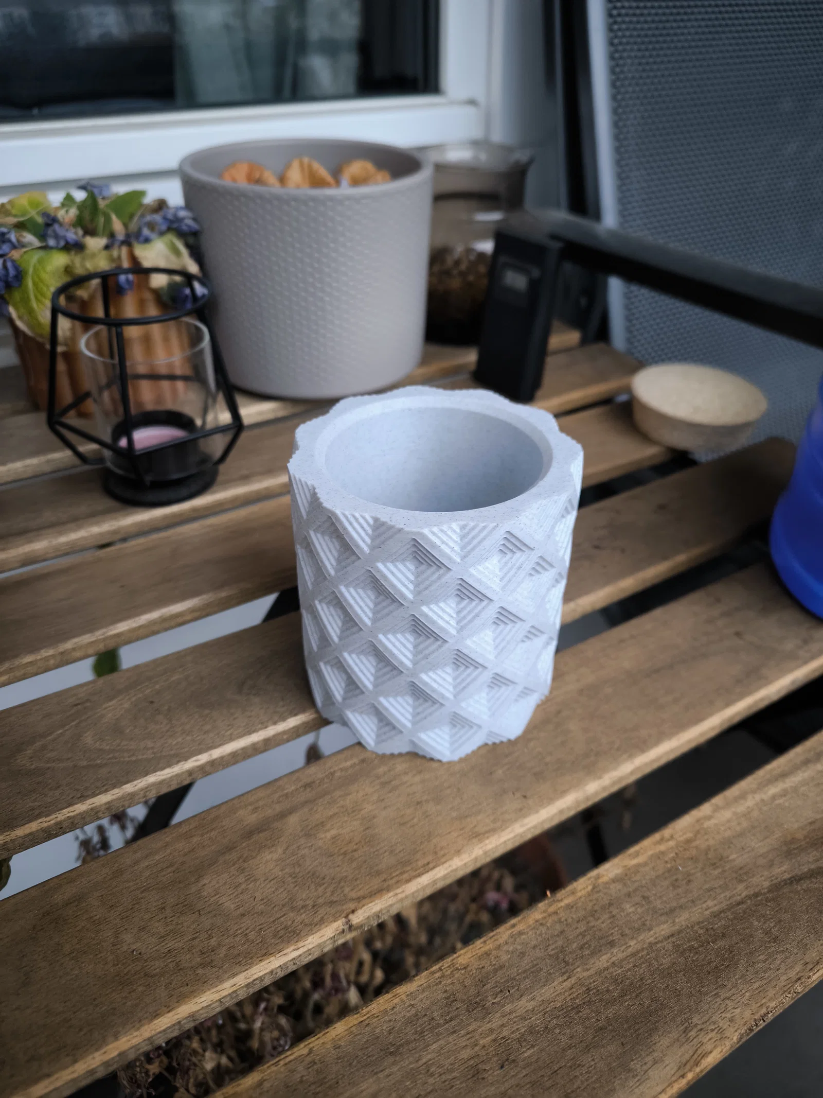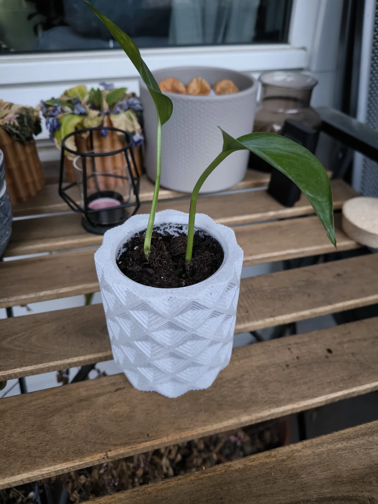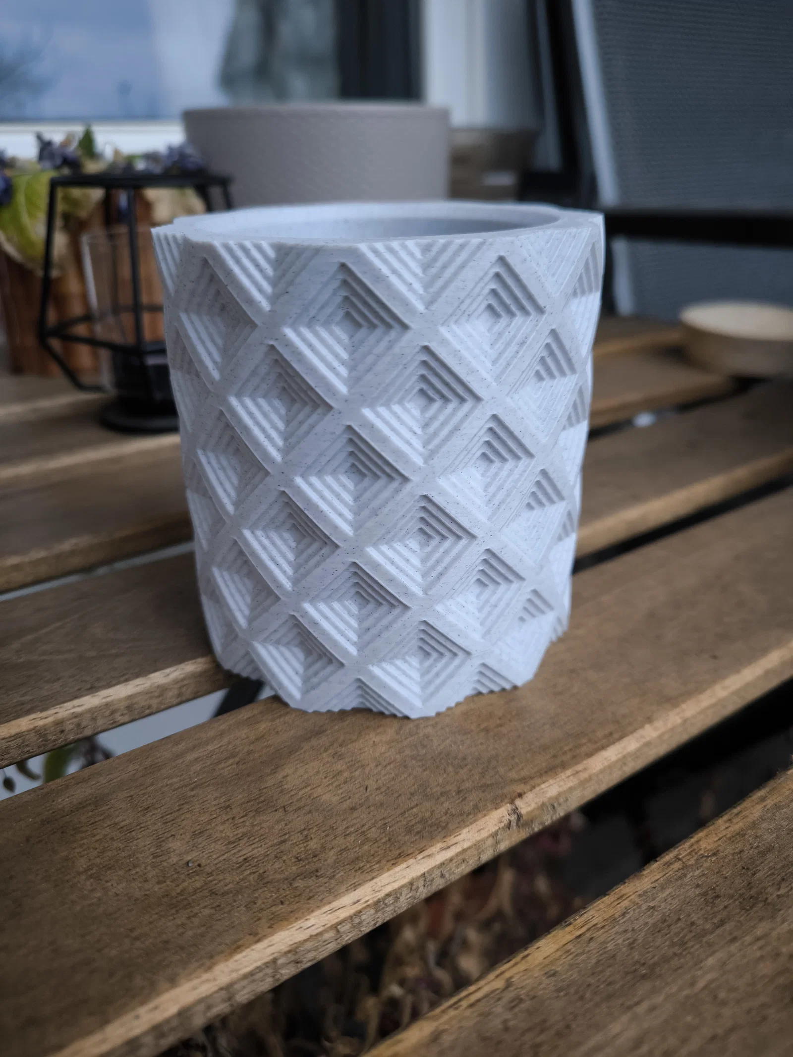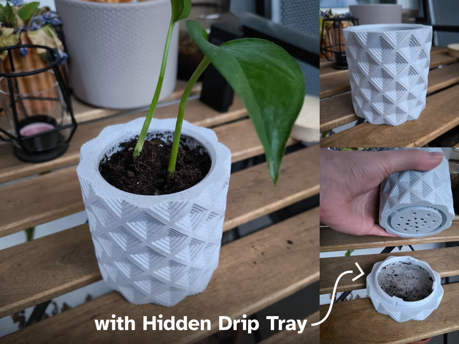… là mẫu chậu cây hiện đại, thiết kế hình học với họa tiết karo xếp tầng. Khay hứng nước ẩn bên trong giúp thoát nước hiệu quả mà vẫn giữ được vẻ ngoài tinh tế. Sản phẩm được tối ưu hóa cho in 3D, in rất dễ dàng mà không cần dùng đến cấu trúc hỗ trợ (support).