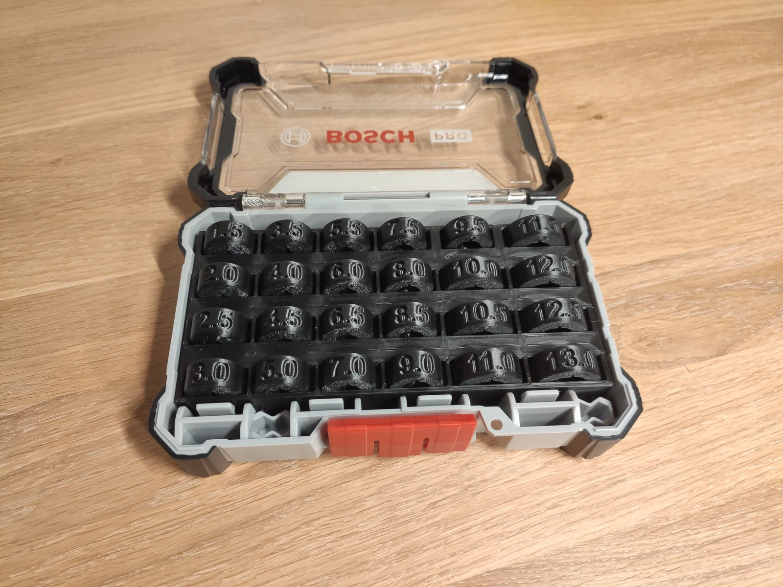 - Lưu ý về khay đựng: Phần insert (khay nhựa) đi kèm được thiết kế tối ưu để chứa các cữ khoan có kích thước từ 1.5 mm đến 13 mm.