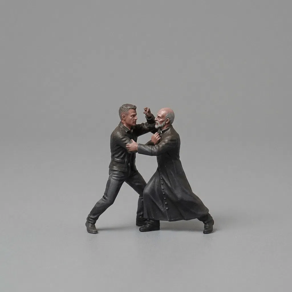 Thiết kế của mô hình được chia làm hai phần riêng biệt để người chơi dễ dàng thực hiện quá trình in ấn và lắp ghép. Phần đế cảnh lớn mô tả chi tiết thị trấn với các kiến trúc đặc trưng và bầu không khí căng thẳng, trong khi đó, phần thứ hai là cụm nhân vật đang giằng co quyết liệt. Điểm thú vị nhất của mô hình này chính là khả năng tùy biến về kích thước; tùy thuộc vào không gian trưng bày, bạn có thể phóng to hoặc thu nhỏ các chi tiết sao cho phù hợp nhất. Đây là dự án rất phù hợp để bạn thử thách kỹ năng sơn tỉ mỉ, giúp làm nổi bật các chi tiết gương mặt và chiều sâu của khung cảnh.