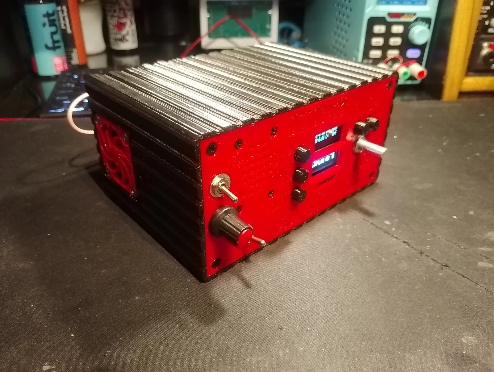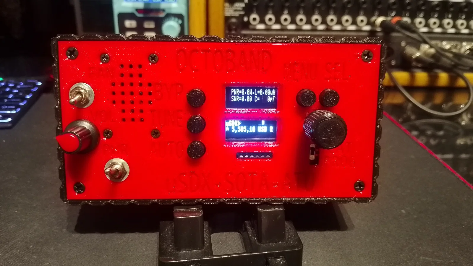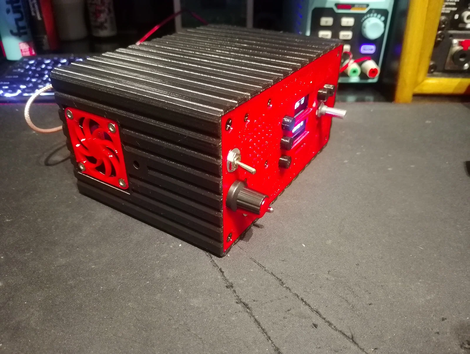 Mình đã bổ sung thêm các vị trí gắn loa ở mặt trước, lắp quạt tản nhiệt trong thân máy để làm mát khi hoạt động trong những ngày hè dài khi mang đài đi dã ngoại hoặc săn DX. Ngoài ra, mình cũng khoét lỗ núm xoay âm lượng cho module khuếch đại 3W, công tắc nguồn và quạt. Mình đã bỏ cổng DC jack gốc trên PCB và thay bằng đầu nối DC 2.1mm riêng để quản lý việc cấp nguồn cho toàn bộ hệ thống. Ở mặt sau máy còn có sẵn một lỗ để lắp cổng USB-C panel mount nếu các bạn muốn tích hợp thêm mạch sạc và pin.