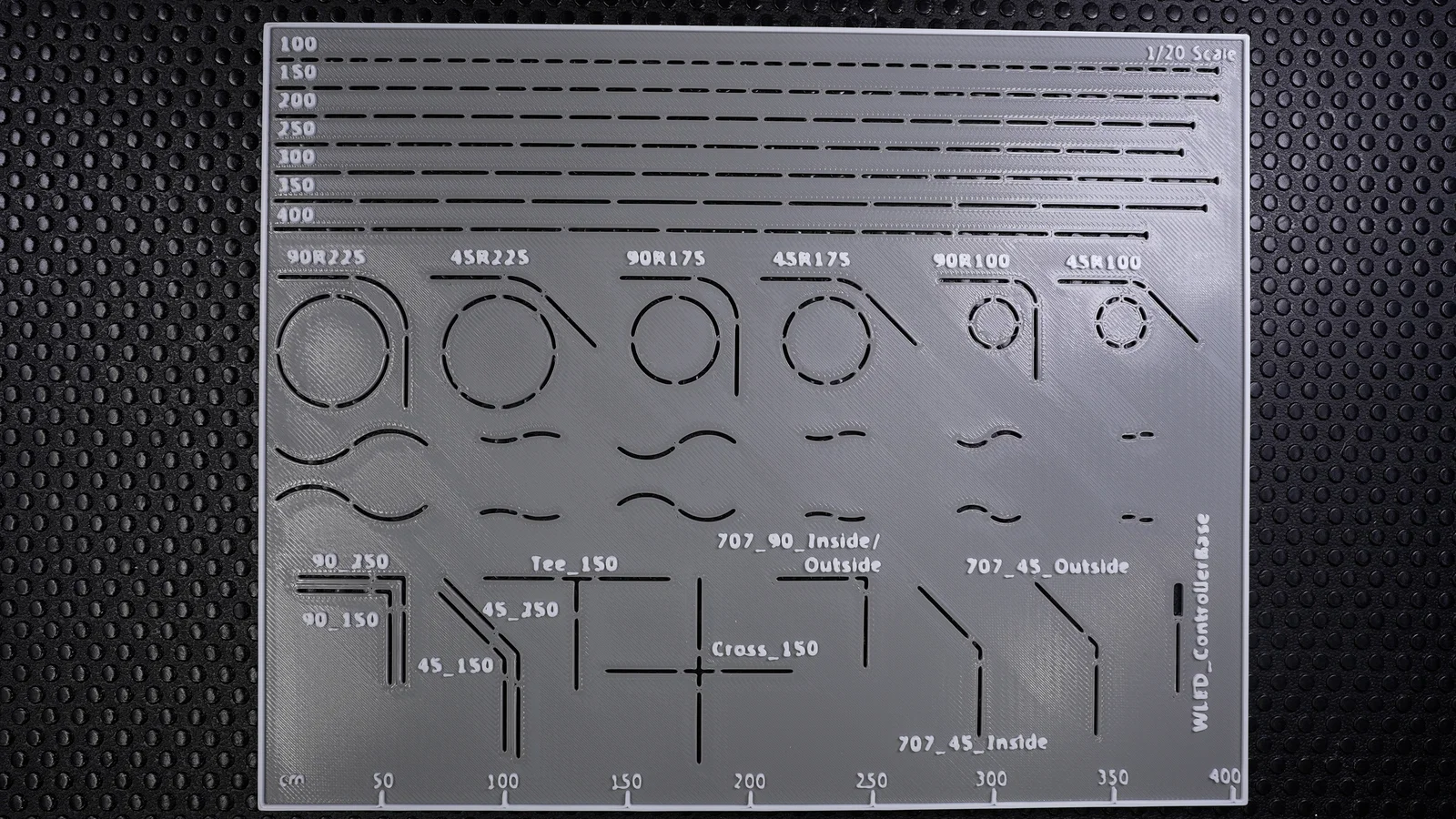 Sử dụng tấm khuôn (stencil) này để hỗ trợ thiết kế và bố trí hệ thống đường ray của bạn. Khuôn được thiết kế theo tỷ lệ 1/20, vì vậy sau khi bạn dùng nó để vẽ mẫu, bạn có thể dựa vào thước đo trên cạnh để xác định kích thước thực tế sau khi hoàn thiện.