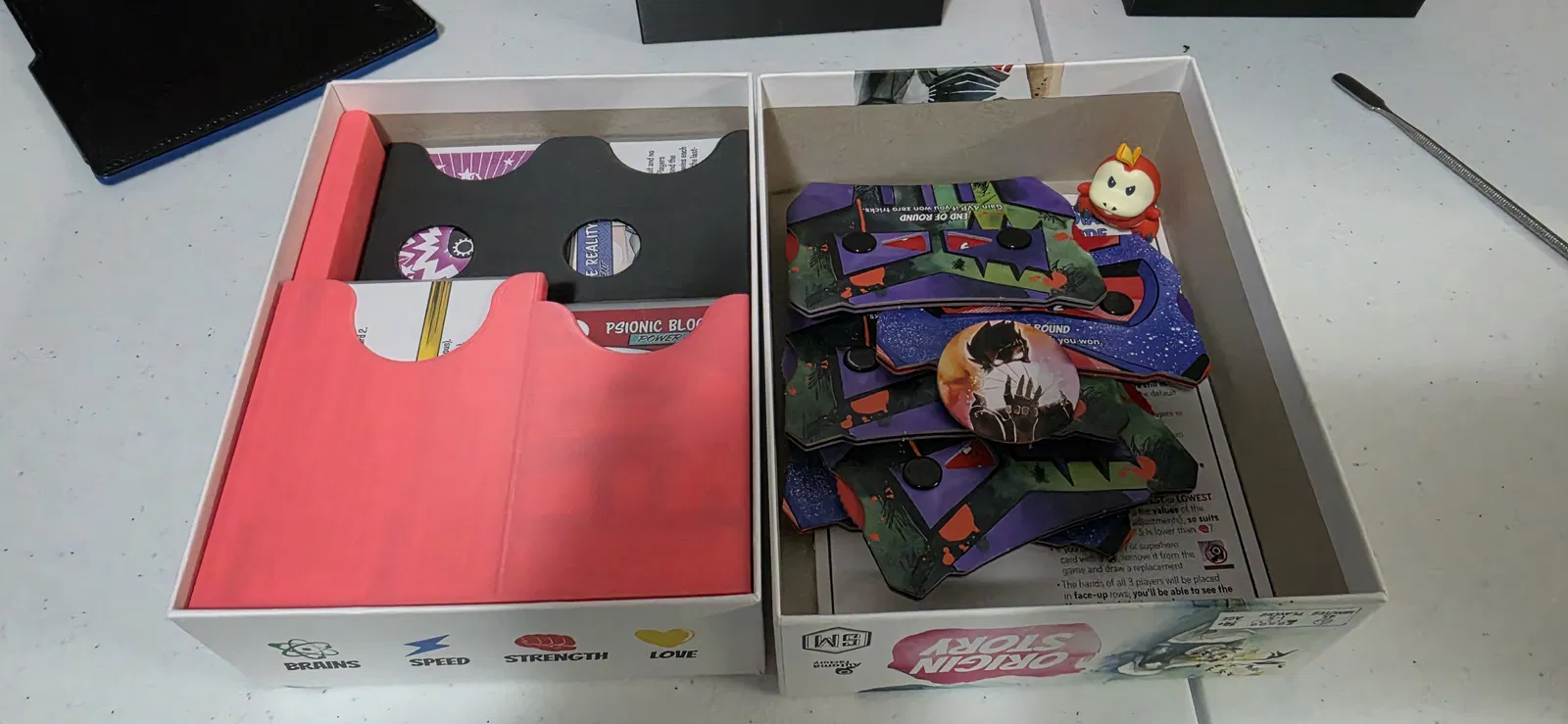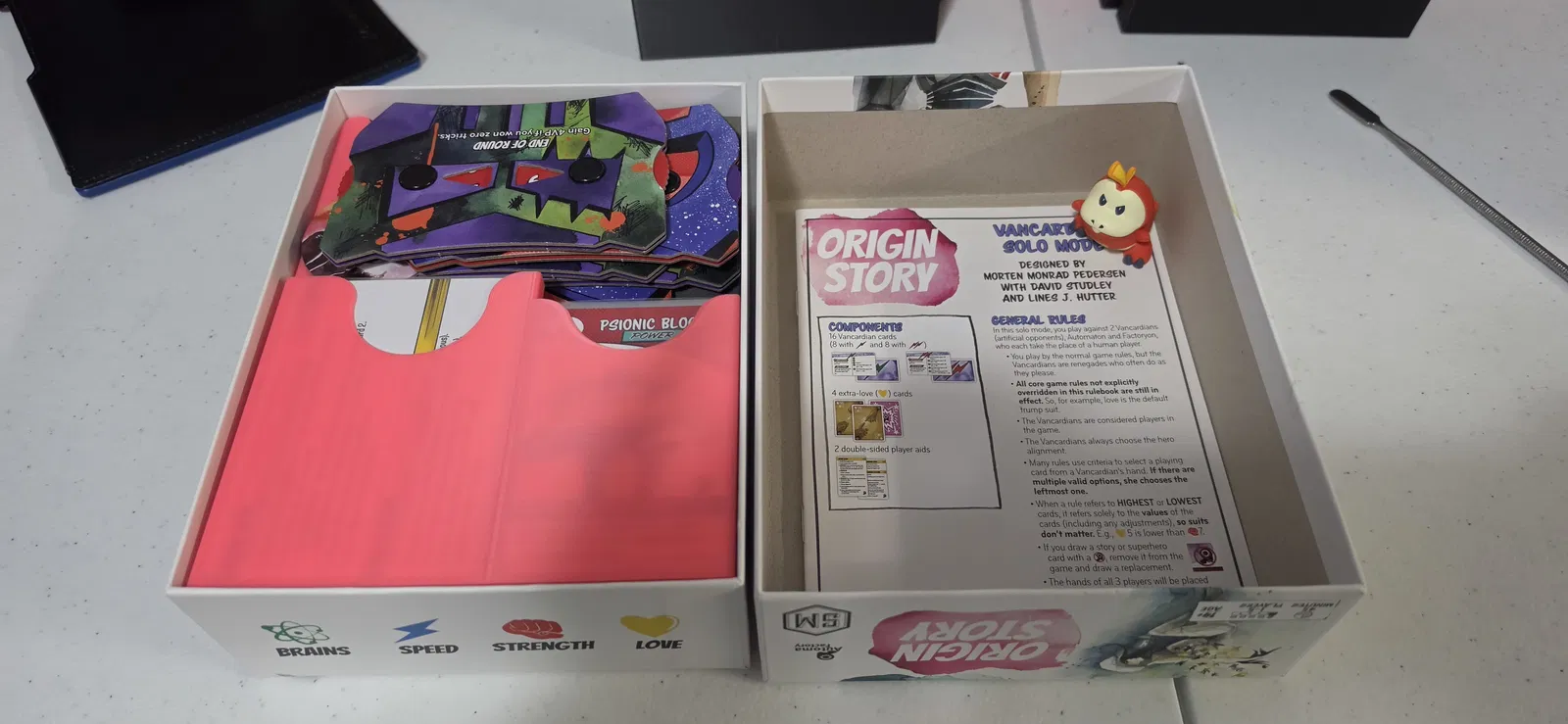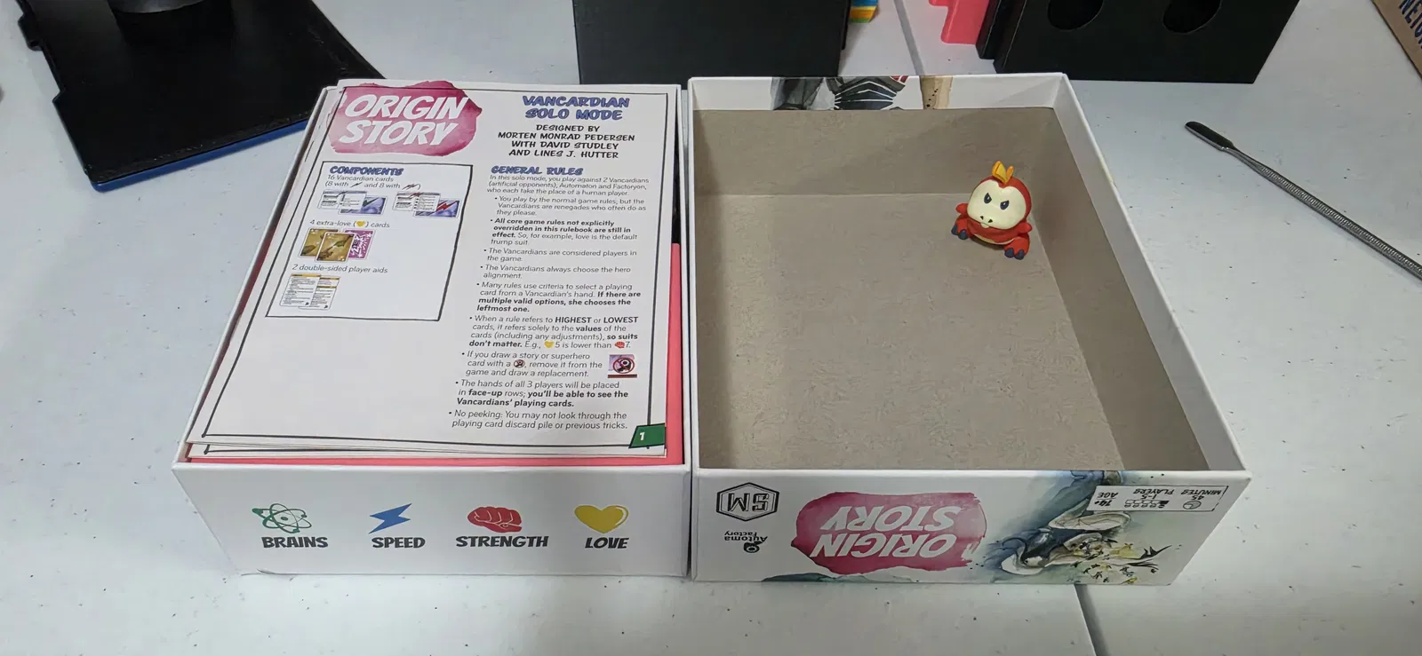 Bộ insert thiết kế riêng cho game Origin Story khi đã bọc sleeve. Mọi chi tiết được tối ưu hóa để vừa khít hoàn hảo, đảm bảo nắp hộp không bị hở. Sản phẩm hỗ trợ lưu trữ linh hoạt cả khi để nằm phẳng hoặc để nghiêng trên kệ.